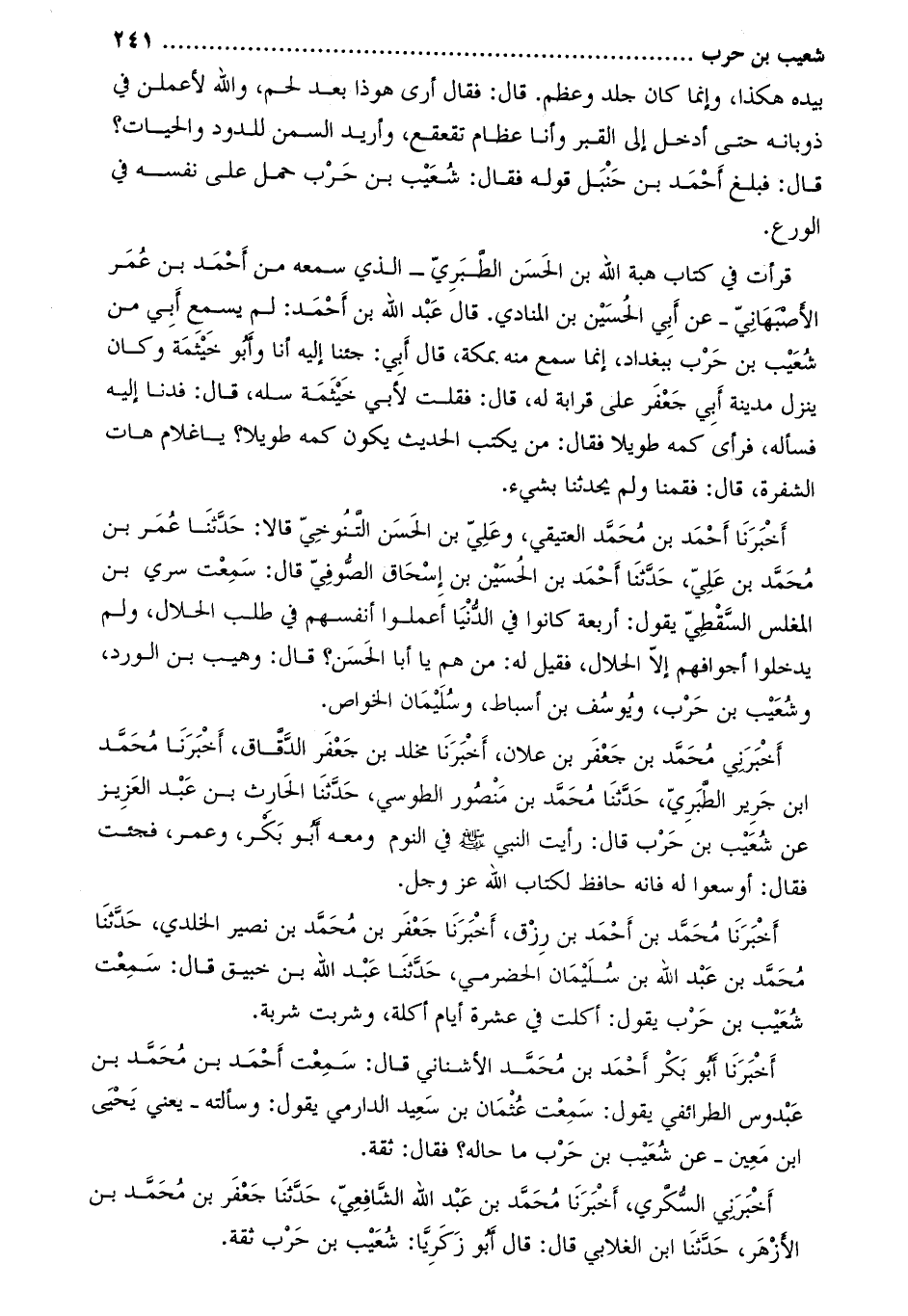 قرأت في كتاب هبة الله بن الحسن الطبري- الذي سمعه من أحمد بن عمر الأصبهاني- عن أبي الحسين بن المنادي. قال عبد الله بن أحمد: لم يسمع أبي من شعيب بن حرب ببغداد، إنما سمع منه بمكة، قال أبي: جئنا إليه أنا وأبو خيثمة وكان ينزل مدينة أبي جعفر على قرابة له، قال: فقلت لأبي خيثمة سله، قال: فدنا إليه فسأله، فرأى كمه طويلا فقال: من يكتب الحديث يكون كمه طويلا؟ يا غلام هات الشفرة، قال: فقمنا ولم يُحَدِّثْنَا بشيء.