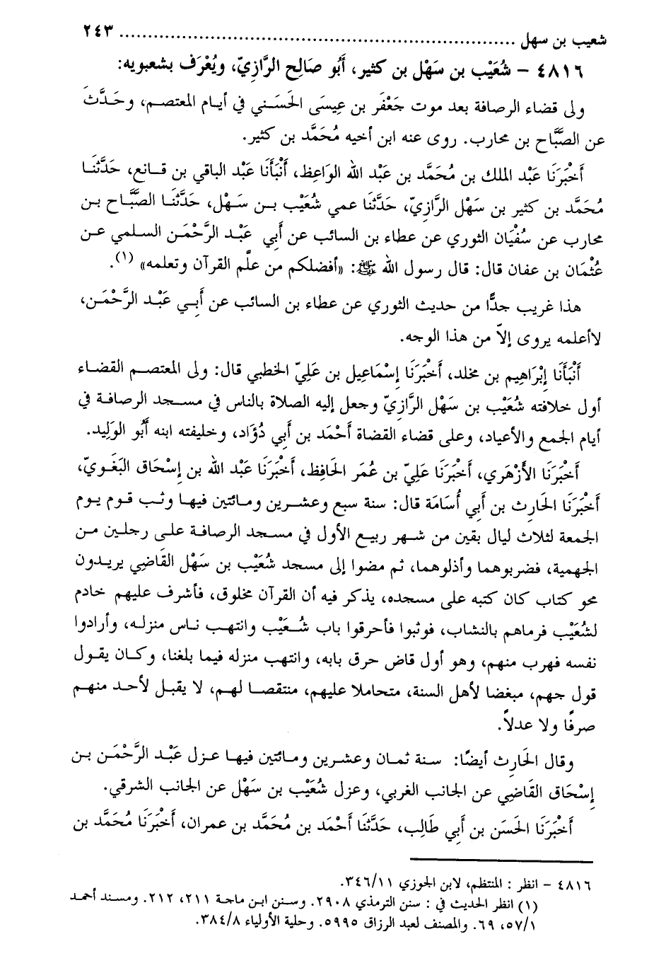 أخبرنا الأزهري، أخبرنا عليّ بن عمر الحافظ، أخبرنا عبد الله بن إسحاق البغويّ، أَخْبَرَنَا الحارث بن أبي أسامة قال: سنة سبع وعشرين ومائتين فيها وثب قوم يوم الجمعة لثلاث ليال بقين من شهر ربيع الأول في مسجد الرصافة على رجلين من الجهمية، فضربوهما وأذلوهما، ثم مضوا إلى مسجد شعيب بن سهل القاضي يريدون محو كتاب كان كتبه على مسجده، يذكر فيه أن القرآن مخلوق، فأشرف عليهم خادم لشعيب فرماهم بالنشاب، فوثبوا فأحرقوا باب شعيب وانتهب ناس منزله، وأرادوا نفسه فهرب منهم، وهو أول قاض حرق بابه، وانتهب منزله فيما بلغنا، وكان يقول قول جهم، مبغضا لأهل السنة، متحاملا عليهم، منتقصا لهم، لا يقبل لأحد منهم صرفا ولا عدلا.