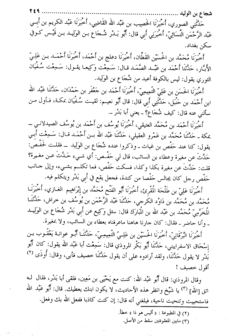 أَخْبَرَنَا أحمد بن محمّد العتيقي، أَخْبَرَنَا يُوسُف بْن أَحْمَد بْن يُوسُف الصيدلاني- بمكة- حدّثنا محمّد بن عمرو العقيلي، حَدَّثَنَا عبد اللَّه بْن أَحْمَد قَالَ: سمعت أبي يقول: كنا عند حفص بن غياث- وذكروا عنده شجاع بن الوليد- فقلت لحفص: