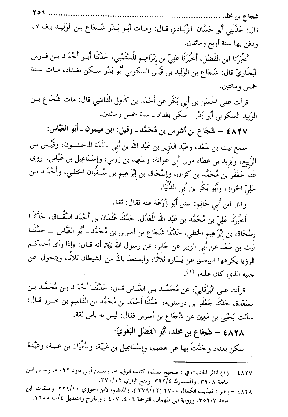 قرأتُ عَلَى الْحَسَن بْن أَبِي بَكْر عَنْ أَحْمَد بْن كامل الْقَاضِي قَالَ: مات شجاع بن الوليد السكوني أبو بدر- سكن بغداد- سنة خمس ومائتين.