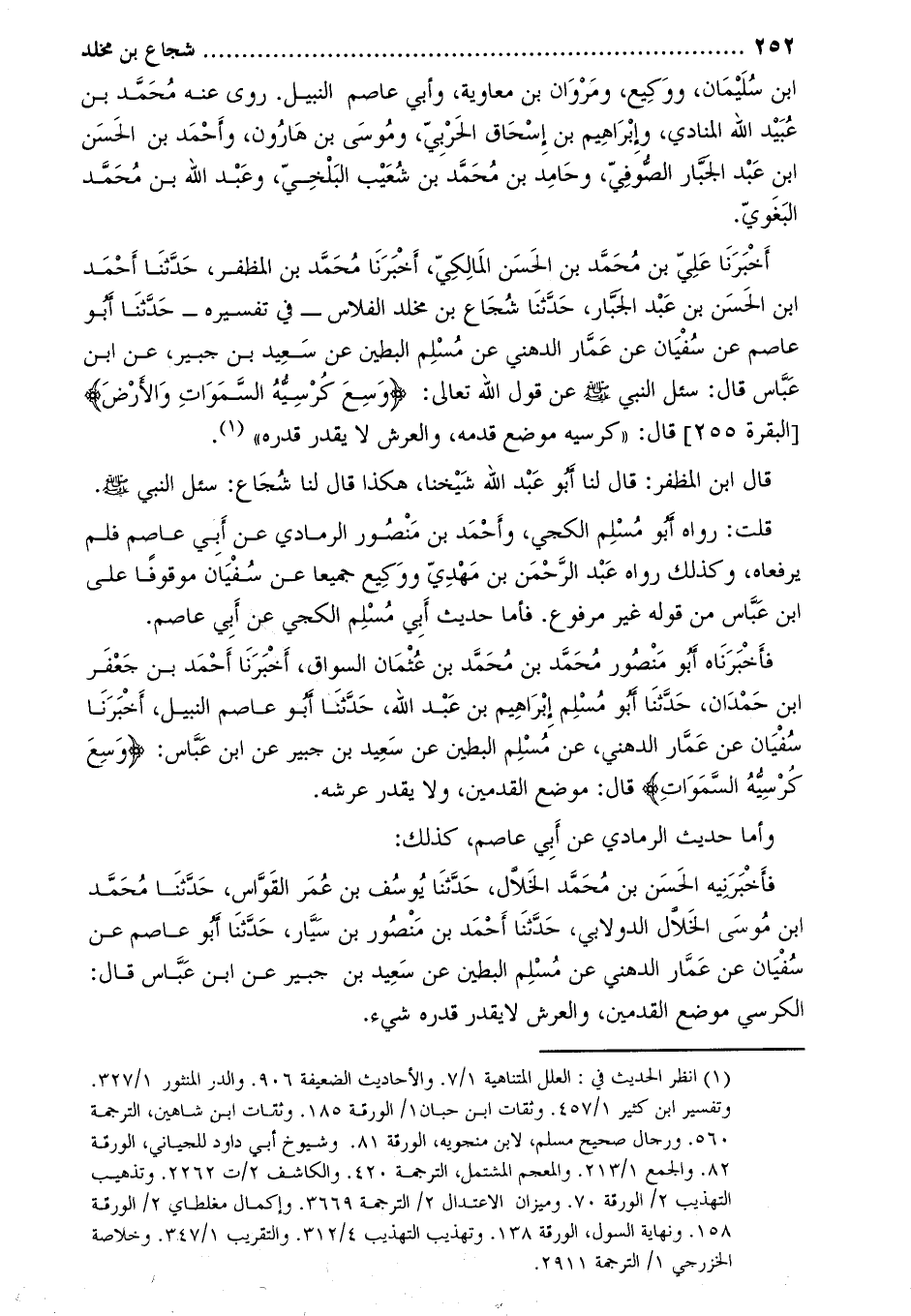 فَأَخْبَرَنَاهُ أَبُو مَنْصُورٍ مُحَمَّدُ بْنُ مُحَمَّدِ بْنِ عُثْمَانَ السواق، أخبرنا أحمد بن جعفر ابن حمدان، حَدَّثَنَا أَبُو مُسْلِمٍ إِبْرَاهِيمُ بْنُ عَبْدِ اللَّهِ، حدّثنا أبو عاصم النبيل، أَخْبَرَنَا سُفْيَانُ عَنْ عَمَّارٍ الدُّهْنِيِّ، عَنْ مُسْلِمٍ الْبَطِينِ عَنْ سَعِيدِ بْنِ جُبَيْرٍ عَنِ ابْنِ عَبَّاسٍ: وَسِعَ كُرْسِيُّهُ السَّماواتِ