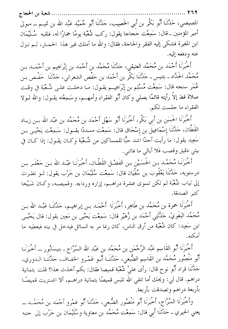 أَخْبَرَنَا أحمد بن محمد العتيقي، حَدَّثَنَا مُحَمَّدُ بْنُ أَحْمَدَ بْنِ إِبْرَاهِيمَ بْنِ أَحْمَد بن محمّد الحدّاد- بتنيس- حَدَّثَنَا بَكْرُ بْن أَحْمَد بْن حَفْصٍ الشَّعْرَانِيُّ، حَدَّثَنَا حفص بن عمر سنجة قال: سمعت مسلم بن إبراهيم يقول: ما دخلت على شعبة في وقت صلاة قط إلا رأيته قائما يصلي وكان أبو الفقراء وأمهم، وسمعته يقول: والله لولا الفقراء ما جلست لكم.