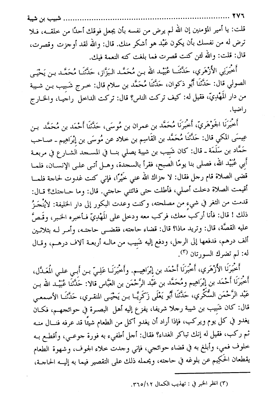 أخبرنا الجوهريّ، أخبرنا محمّد بن عمران بن موسى، حَدَّثَنَا أَحْمَد بن مُحَمَّد بن عيسى المكي قَالَ: حَدَّثَنَا مُحَمَّد بن القاسم بن خلاد عن موسى بن إبراهيم- صاحب حماد بن سلمة- قال: كان شبيب بن شيبة يصلي بنا في المسجد الشارع في مربعة أبي عبيد الله، فصلى بنا يوما الصبح، فقرأ بالسجدة، وهَلْ أَتَى عَلَى الإِنْسَانِ، فلما قضى الصلاة قام رجل فقال: لا جزاك الله عني خيرا، فإني كنت غدوت لحاجة فلما أقيمت الصلاة دخلت أصلي، فأطلت حتى فاتتني حاجتي. قال: وما حاجتك؟ قال: