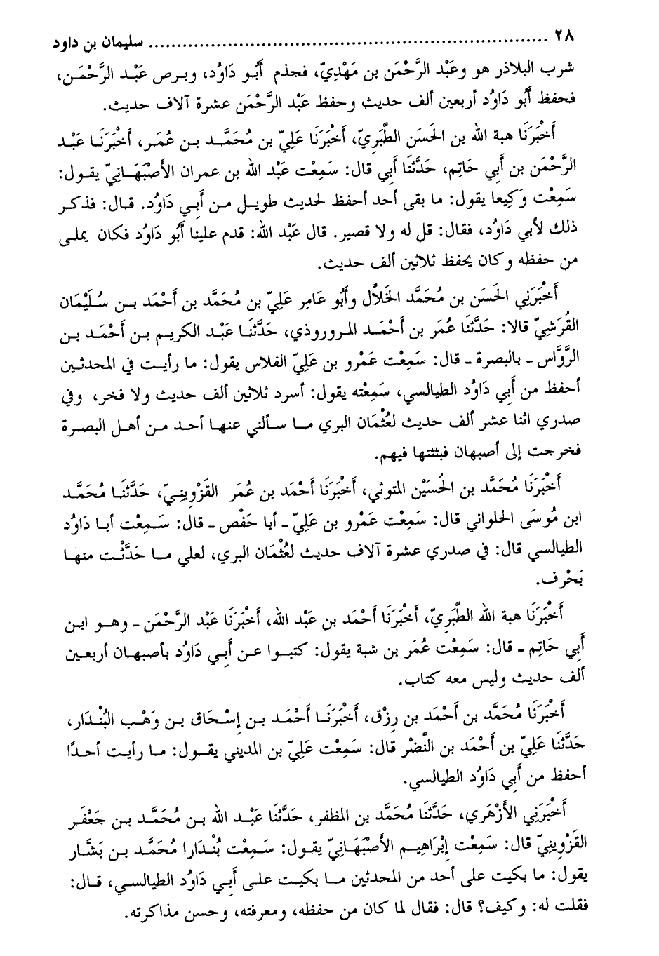أخبرني الأزهري، حدّثنا محمّد بن المظفر، حَدَّثَنَا عَبْد اللَّه بْن مُحَمَّد بْن جعفر القزويني قال: سمعت إبراهيم الأصبهاني يقول: سمعت بندارا محمد بن بشار يقول: ما بكيت على أحد من المحدثين ما بكيت على أبي داود الطيالسي، قال: