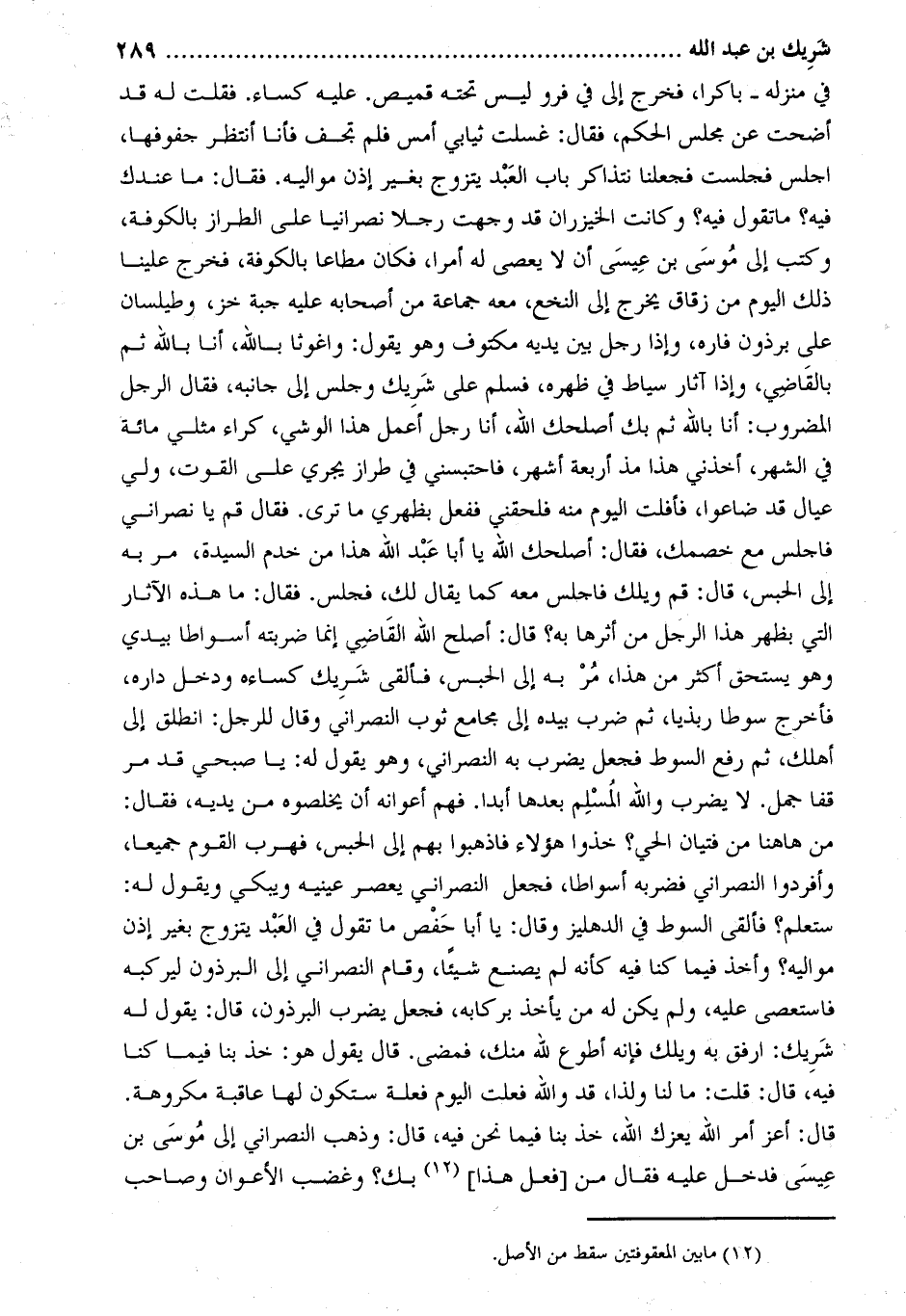 في منزله- باكرا، فخرج إلي في فرو ليس تحته قميص. عليه كساء. فقلت له قد أضحت عن مجلس الحكم، فقال: غسلت ثيابي أمس فلم تجف فأنا أنتظر جفوفها، اجلس فجلست فجعلنا نتذاكر باب العبد يتزوج بغير إذن مواليه. فقال: ما عندك فيه؟ ما تقول فيه؟ وكانت الخيزران قد وجهت رجلا نصرانيا على الطراز بالكوفة، وكتب إلى موسى بن عيسى أن لا يعصي له أمرا، فكان مطاعا بالكوفة، فخرج علينا ذلك اليوم من زقاق يخرج إلى النخع، معه جماعة من أصحابه عليه جبة خز، وطيلسان على برذون فاره، وإذا رجل بين يديه مكتوف وهو يقول: وا غوثاه بالله، أنا بالله ثم بالقاضي، وإذا آثار سياط في ظهره، فسلم على شريك وجلس إلى جانبه، فقال الرجل المضروب: أنا بالله ثم بك أصلحك الله، أنا رجل أعمل هذا الوشي، كراء مثلي مائة في الشهر، أخذني هذا مذ أربعة أشهر، فاحتبسني في طراز يجري على القوت، ولي عيال قد ضاعوا، فأفلت اليوم منه فلحقني ففعل بظهري ما ترى. فقال قم يا نصراني فاجلس مع خصمك، فقال: أصلحك الله يا أبا عبد الله هذا من خدم السيدة، مر به إلى الحبس، قال: قم ويلك فاجلس معه كما يقال لك، فجلس. فقال: ما هذه الآثار التي بظهر هذا الرجل من أثرها به؟ قال: أصلح الله القاضي إنما ضربته أسواطا بيدي وهو يستحق أكثر من هذا، مر به إلى الحبس، فألقى شريك كساءه ودخل داره، فأخرج سوطا ربذيا، ثم ضرب بيده إلى مجامع ثوب النصراني وقال للرجل: انطلق إلى أهلك، ثم رفع السوط فجعل يضرب به النصراني، وهو يقول له: يا صبحي قد مر قفا جمل. لا يضرب والله المسلم بعدها أبدا. فهم أعوانه أن يخلصوه من يديه، فقال: