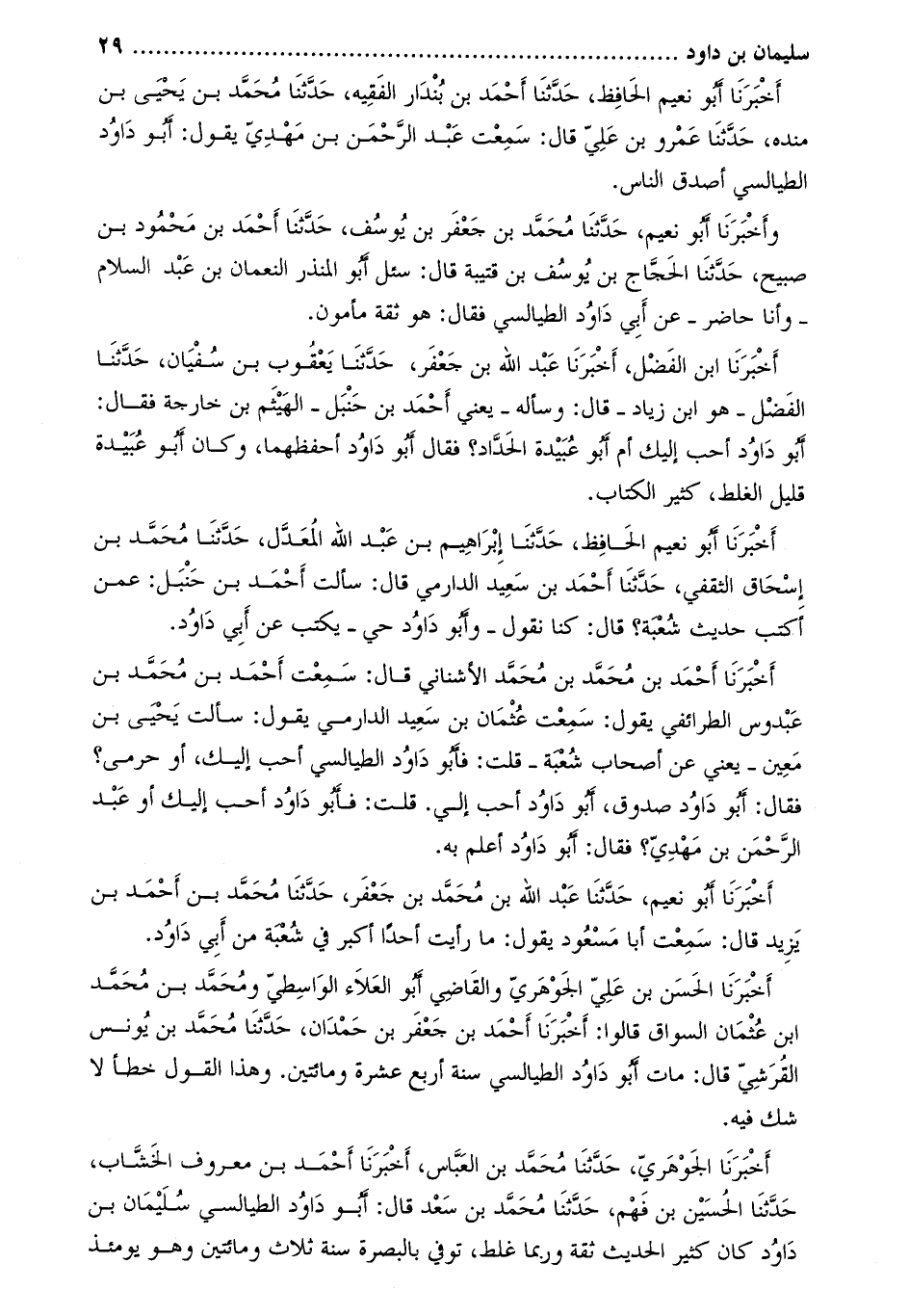 أَخْبَرَنَا أبو نعيم الحافظ، حدّثنا إبراهيم بن عبد الله المعدّل، حدّثنا محمّد بن إسحاق الثقفي، حَدَّثَنَا أحمد بن سعيد الدارمي قال: سألت أحمد بن حنبل: عمن أكتب حديث شعبة؟ قال: كنا نقول- وأبو داود حي- يكتب عن أبي داود.