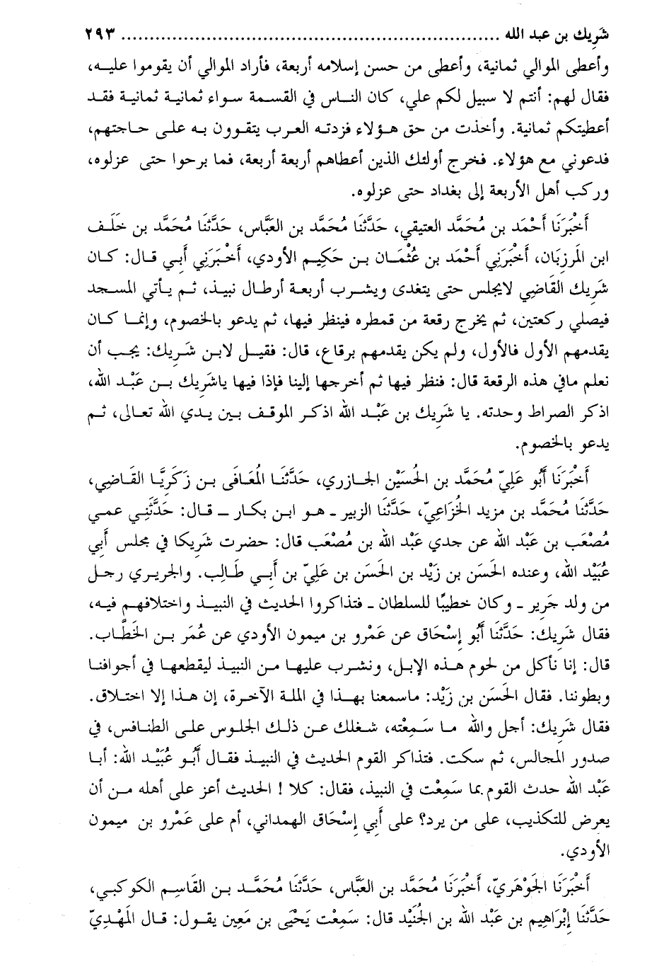 أَخْبَرَنَا أَبُو عَلِيٍّ مُحَمَّد بْن الْحُسَيْن الجازري، حدّثنا المعافى بن زكريّا القاضي، حدّثنا محمّد بن مزيد الخزاعيّ، حَدَّثَنَا الزبير- هو ابن بكار- قَالَ: حَدَّثَنِي عمي مصعب بْن عَبْد الله عن جدي عبد الله بن مصعب قال: حضرت شريكا في مجلس أبي عبيد الله، وعنده الْحَسَن بن زيد بْن الْحَسَن بْن عَلِيّ بْن أبي طالب. والجريري رجل من ولد جرير- وكان خطيبا للسلطان- فتذاكروا الحديث في النبيذ واختلافهم فيه، فقال شريك: حَدَّثَنَا أَبُو إسحاق عن عمرو بن ميمون الأودي عن عمر بن الخطاب.