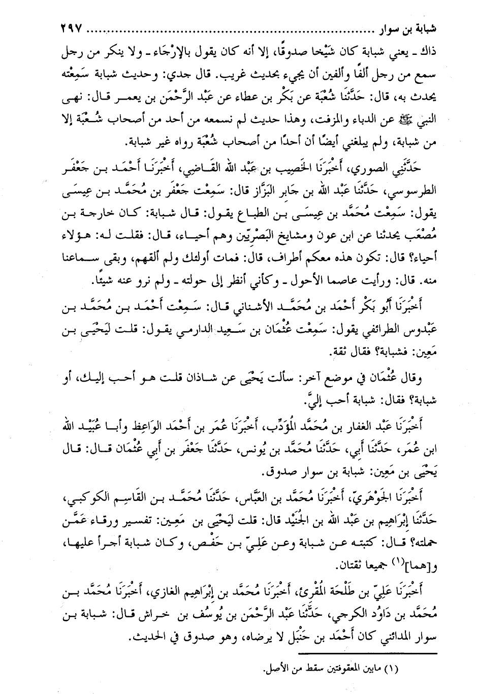 وقال عثمان في موضع آخر: سألت يحيى عن شاذان قلت هو أحب إليك، أو شبابة؟ فقال: شبابة أحب إلي.