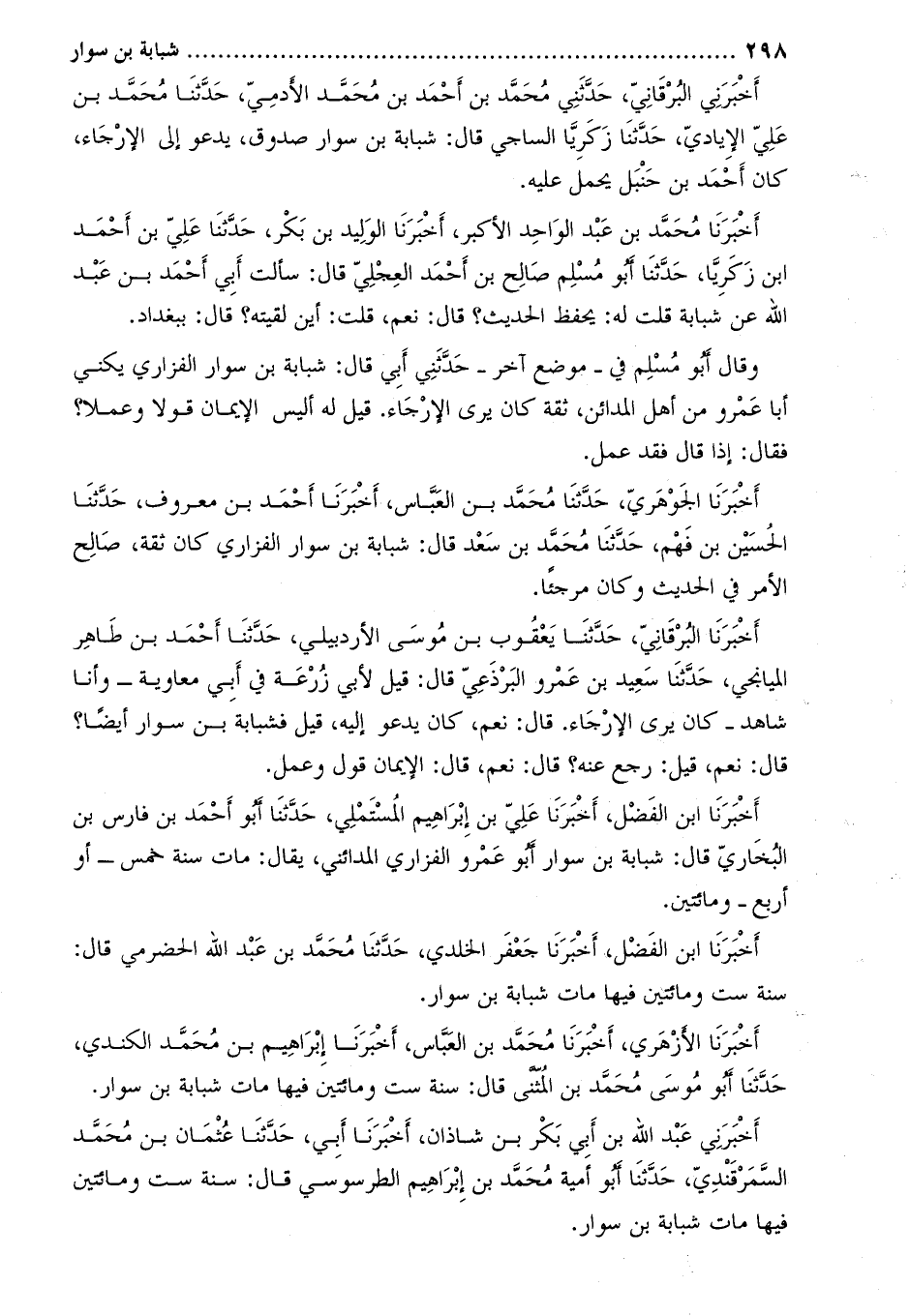 أخبرني البرقانيّ، حَدَّثَنِي مُحَمَّد بْن أَحْمَدَ بْن مُحَمَّد الآدمي، حدّثنا محمّد بن عليّ الإياديّ، حَدَّثَنَا زكريا الساجي قال: شبابة بن سوار صدوق، يدعو إلى الأرجاء، كان أحمد بن حنبل يحمل عَلَيْهِ.