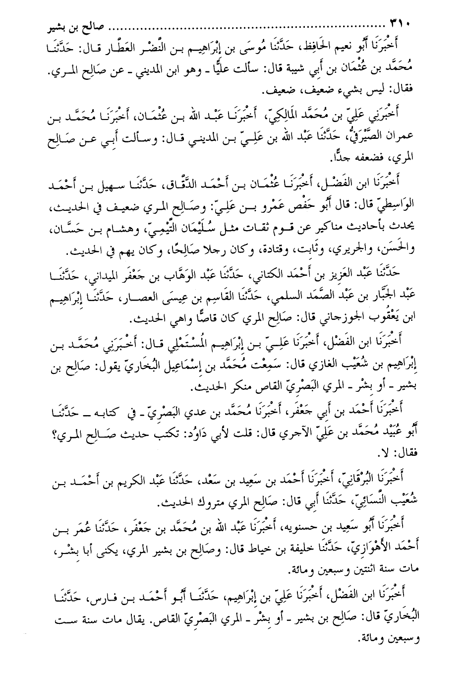 أخبرنا أبو نعيم الحافظ، حَدَّثَنَا مُوسَى بْن إِبْرَاهِيمَ بْن النَّضْر الْعَطَّار قال: حدثنا محمد بن عثمان بن أبي شيبة قال: سألت عليا- وهو ابن المديني- عن صالح المري.