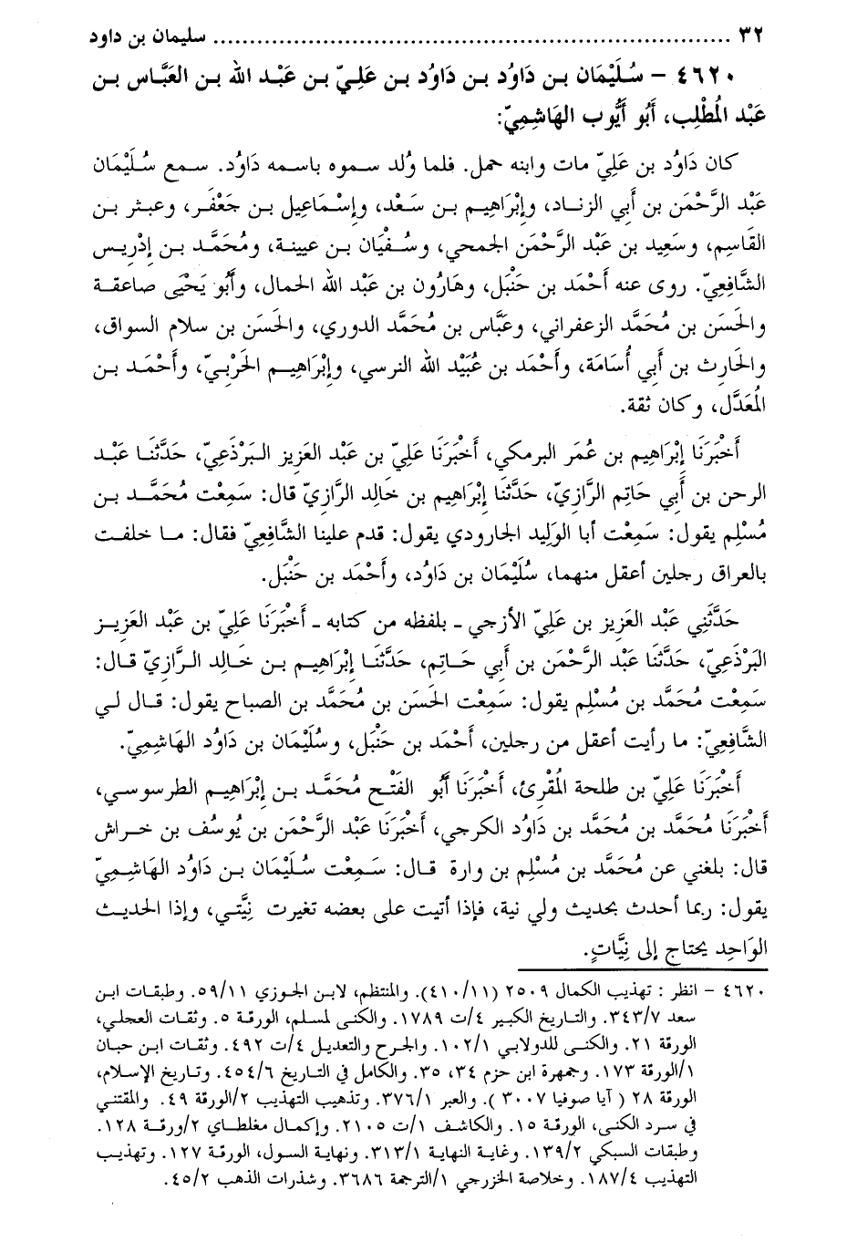 أَخْبَرَنَا علي بن طلحة المقرئ، أَخْبَرَنَا أبو الفتح محمد بن إبراهيم الطرسوسي، أخبرنا محمد بن محمد بن داود الكرجي، أَخْبَرَنَا عبد الرحمن بن يوسف بن خراش قَالَ: بلغني عَنْ مُحَمَّد بْن مُسْلِم بْن وارة قَالَ: سمعت سليمان بن داود الهاشمي يقول: ربما أحدث بحديث ولي نية، فإذا أتيت على بعضه تغيرت نيتي، وإذا الحديث الواحد يحتاج إلى نيّات.