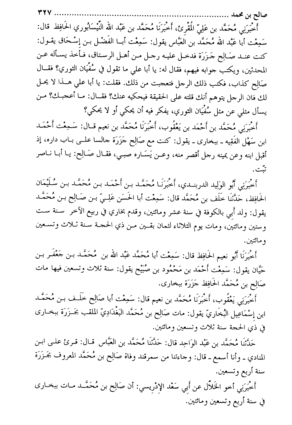 أَخْبَرَنَا أَبُو نعيم الْحَافِظُ قَالَ: سمعت أبا مُحَمَّدٍ عَبْدُ اللَّهِ بْنُ مُحَمَّدِ بْنِ جَعْفَرِ بْن حيان يَقُولُ: سَمِعْتُ أَحْمَد بْن محمود بن صبيح يقول: سنة ثلاث وتسعين فيها مات صالح بن محمد الحافظ جزرة ببخارى.