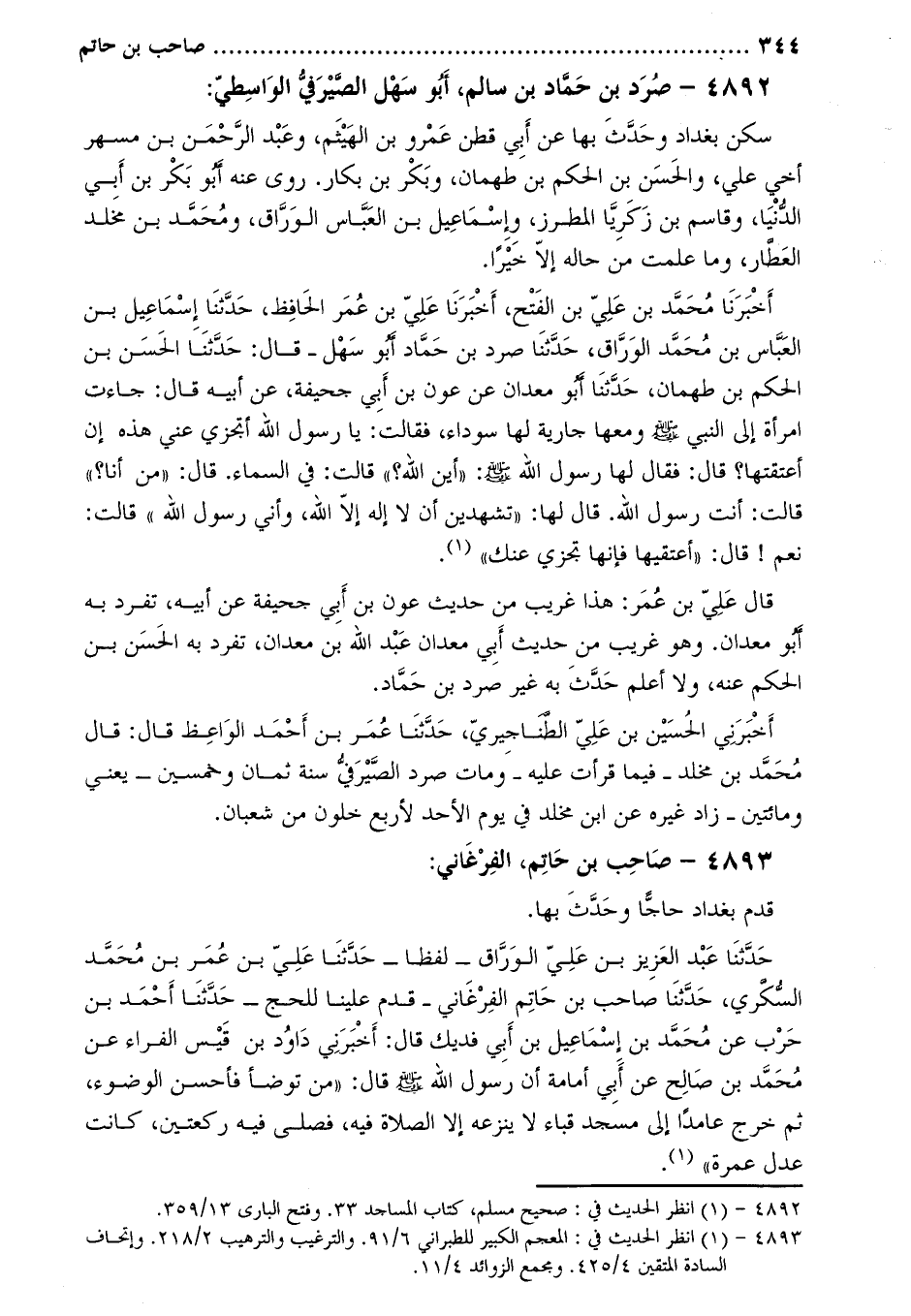 أَخْبَرَنَا مُحَمَّدُ بْنُ عَلِيِّ بْنِ الْفَتْحِ، أَخْبَرَنَا عَلِيُّ بْنُ عمر الحافظ، حَدَّثَنَا إِسْمَاعِيلُ بْنُ الْعَبَّاسِ بْنِ مُحَمَّدٍ الْوَرَّاقُ، حَدَّثَنَا صُرَدُ بْنُ حَمَّادٍ أَبُو سَهْلٍ- قَالَ: حدّثنا الحسن بن الحكم بن طهمان، حَدَّثَنَا أَبُو مَعْدَانَ عَنْ عَوْنِ بْنِ أَبِي جُحَيْفَةَ، عَنْ أَبِيهِ قَالَ: جَاءَتِ امْرَأَةٌ إِلَى النَّبِيِّ صَلَّى اللَّهُ عَلَيْهِ وَسَلَّمَ وَمَعَهَا جَارِيَةٌ لَهَا سَوْدَاءُ، فَقَالَتْ: يَا رَسُولَ اللَّهِ أَتَجْزِي عَنِّي هَذِهِ إِنْ أَعْتَقْتُهَا؟ قَالَ: فَقَالَ لَهَا رَسُولُ اللَّهِ صَلَّى اللَّهُ عَلَيْهِ وَسَلَّمَ: «أَيْنَ اللَّهُ؟» قَالَتْ: فِي السَّمَاءِ. قَالَ: «مَنْ أَنَا؟» قَالَتْ: أَنْتَ رَسُولُ اللَّهِ. قَالَ لَهَا: «تَشْهَدِينَ أَنْ لا إِلَهَ إِلا اللَّهُ، وَأَنِّي رَسُولُ اللَّهِ» قَالَتْ: