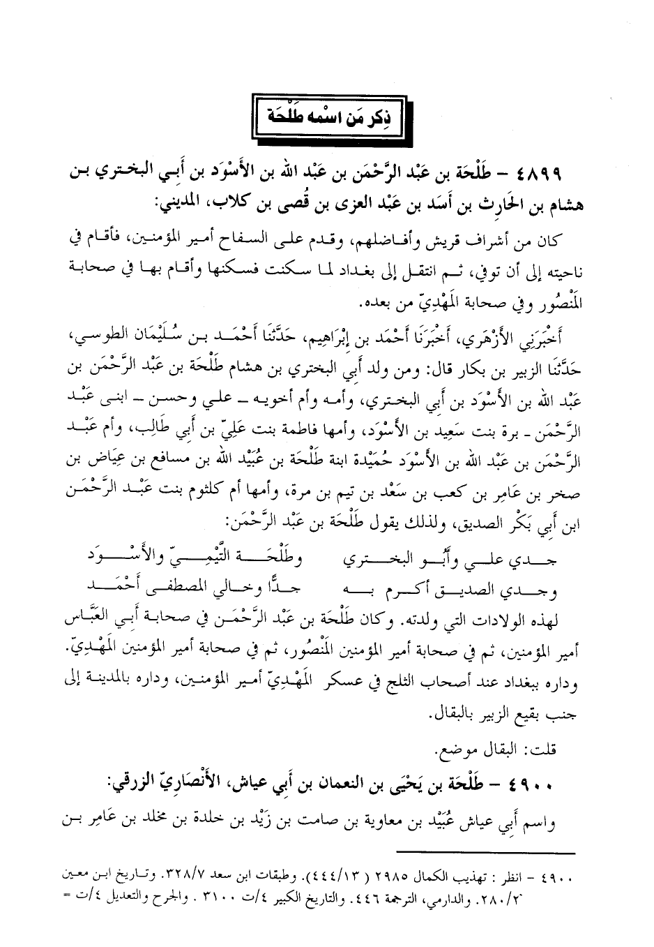 4899- طلحة بن عَبْد الرَّحْمَن بن عبد الله بن الأسود بن أبي البختري بن هشام بن الحارث بن أسد بن عبد العزى بن قصي بن كلاب، المديني: