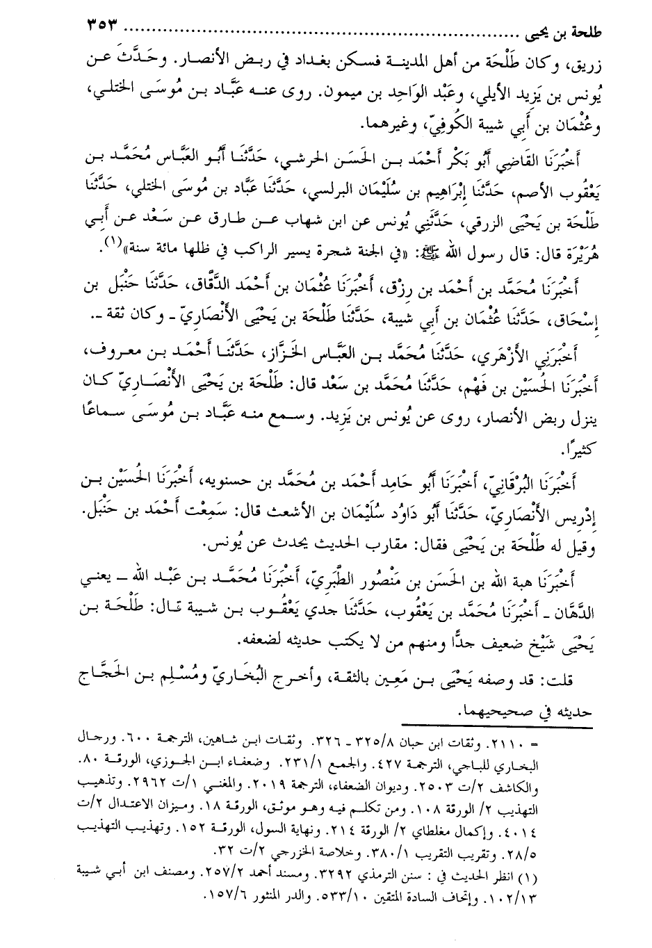 . أَخْبَرَنَا مُحَمَّد بْن أَحْمَد بْن رزق، أخبرنا عثمان بن أحمد الدّقّاق، حدّثنا حنبل بن إسحاق، حدّثنا عثمان بن أبي شيبة، حَدَّثَنَا طلحة بن يحيى الأنصاري- وكان ثقة-.