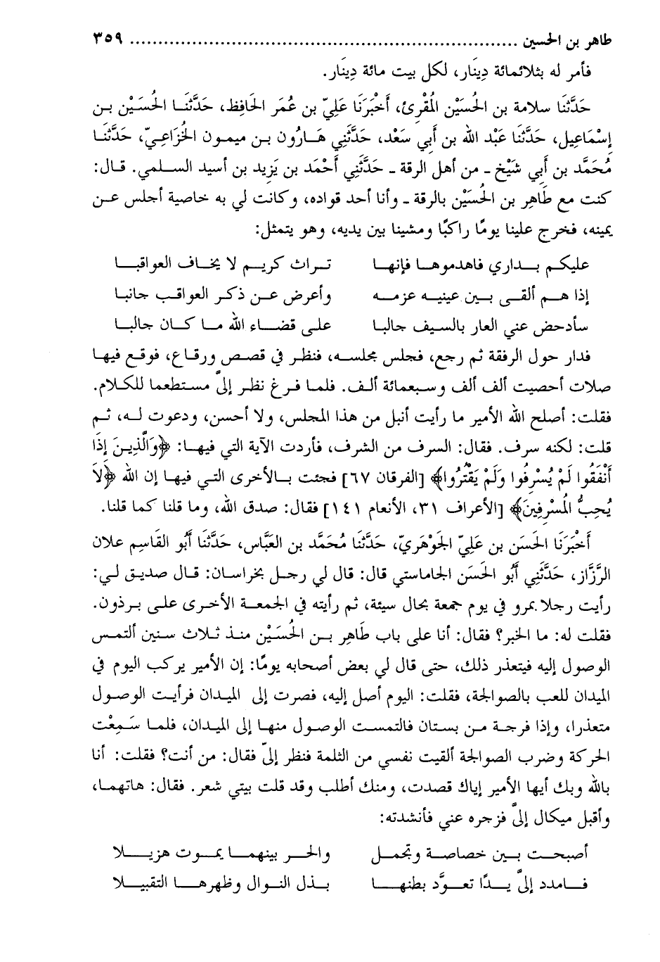 كنت مع طاهر بن الحسين بالرقة- وأنا أحد قواده، وكانت لي به خاصية أجلس عن يمينه، فخرج علينا يوما راكبا ومشينا بين يديه، وهو يتمثل: