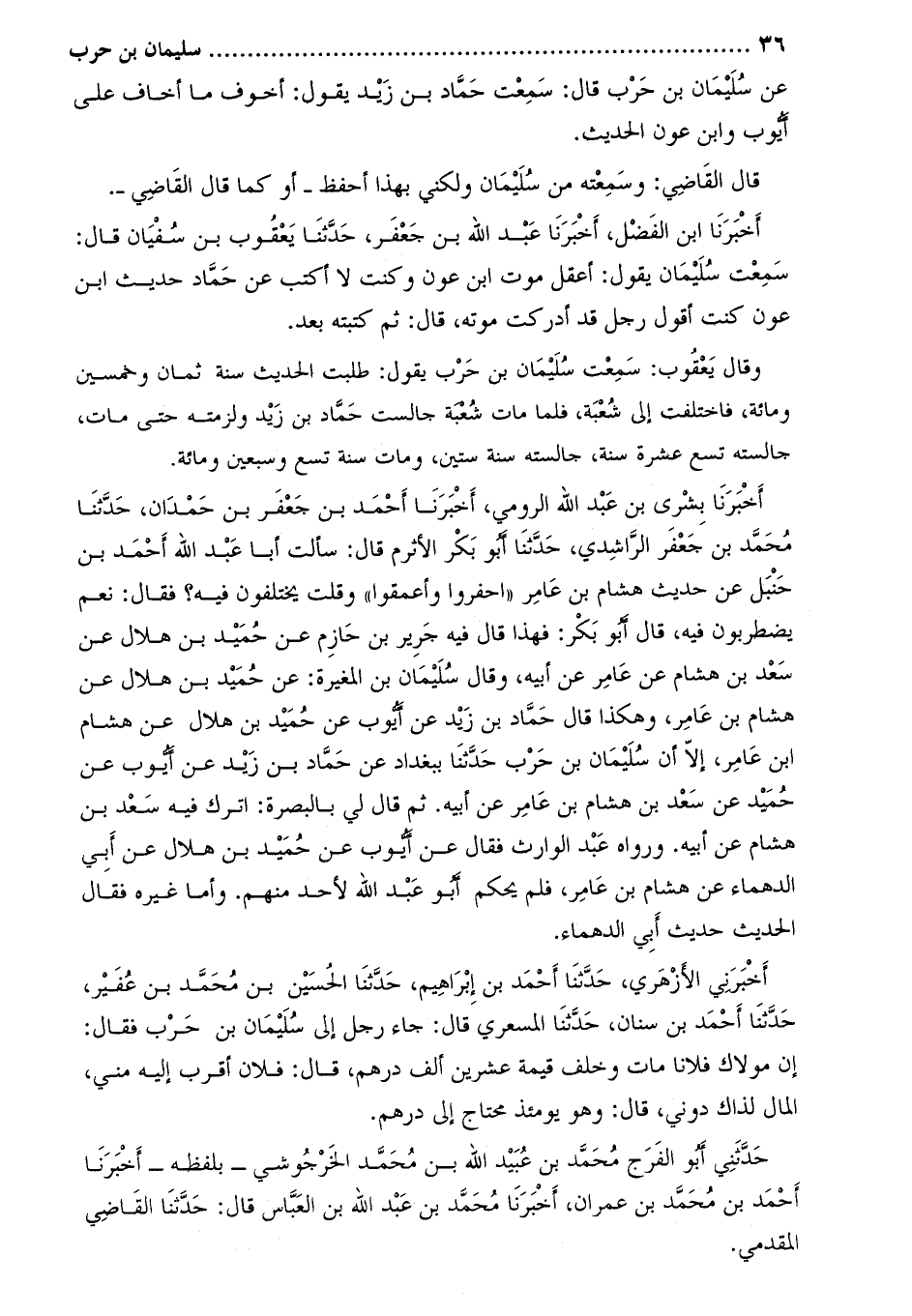 أَخْبَرَنِي الأزهري، حدّثنا أحمد بن إبراهيم، حدّثنا الحسين بن محمّد بن عفير، حدّثنا أحمد بن سنان، حَدَّثَنَا المسعري قال: جاء رجل إلى سليمان بن حرب فقال: