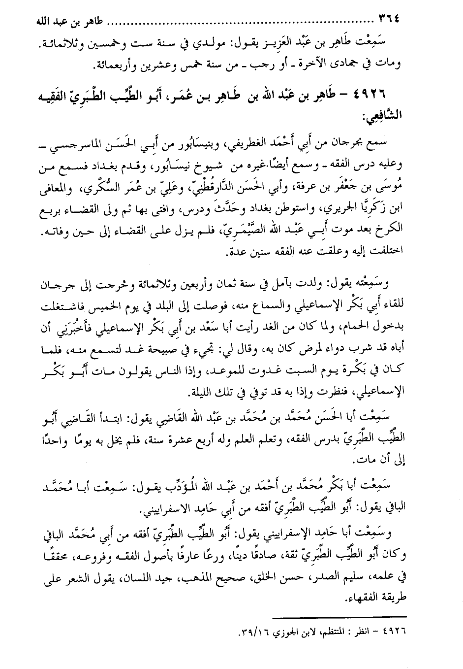 4926- طاهر بن عبد الله بن طاهر بن عمر، أبو الطيب الطبري الفقيه الشافعي [1] :