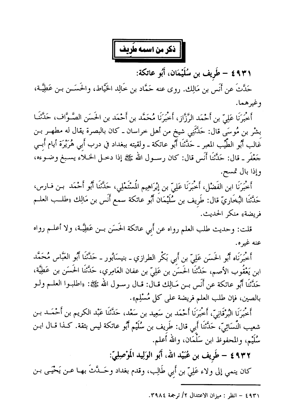 أخبرنا ابن الفضل، أخبرنا عليّ بن إبراهيم المستملي، حدّثنا أبو أحمد بن فارس، حدّثنا البخاريّ قال: طريف بن سليمان أبو عاتكة سمع أنس بن مالك «طَلْبُ الْعِلْمِ فَرِيضَةٌ» منكر الحديث.