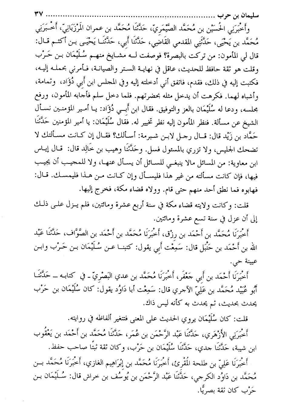 أخبرني الأزهري، حدّثنا عبد الرّحمن بن عمر، حدّثنا محمّد بن أحمد بن يعقوب ابن شيبة، حدّثنا جدي، حدّثنا سليمان بن حرب، وكان ثقة ثبتا صاحب حفظ.