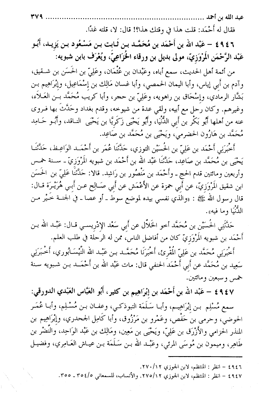 4946- عَبْدُ اللَّهِ بْنُ أَحْمَدَ بْنِ مُحَمَّدِ بْنِ ثابت بن مسعود بن يزيد، أبو عبد الرحمن الْمَرْوَزِيّ، مولى بديل بن ورقاء الْخُزَاعِيّ، ويعرف بابن شبويه [1] :