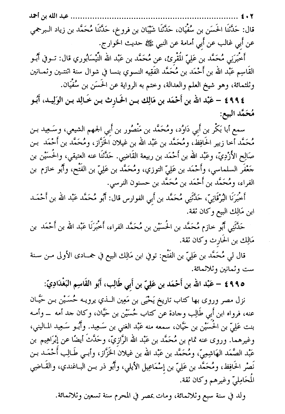 4994- عبد الله بن أَحْمَد بن مالك بن الحارث بن خالد بن الوليد، أبو مُحَمَّد البيع: