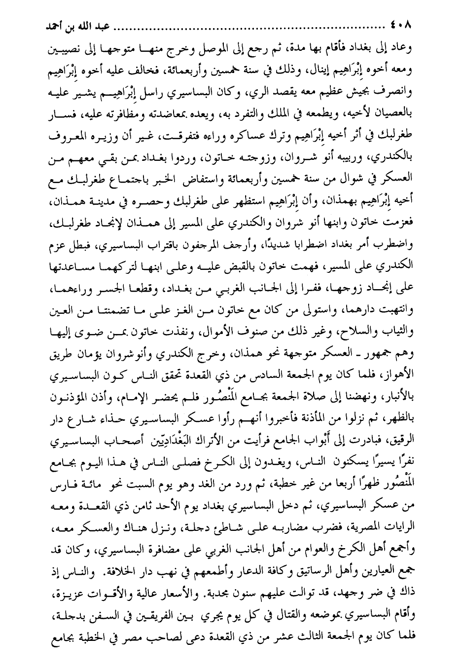 وَعاد إِلَى بَغْدَاد فأقام بها مدة، ثُمَّ رجع إلى الموصل وخرج منها متوجهًا إلى نصيبين ومعه أخوه إِبْرَاهِيم إينال، وذلك في سنة خمسين وأربعمائة، فخالف عليه أخوه إِبْرَاهِيم وانصرف بجيش عظيم معه يقصد الري، وكان البساسيري راسل إِبْرَاهِيم يشير عليه بالعصيان لأخيه، ويطمعه في الملك والتفرد به، ويعده بمعاضدته ومظافرته عليه، فسار طغرلبك في أثر أخيه إِبْرَاهِيم وترك عساكره وراءه فتفرقت، غير أن وزيره المعروف بالكندري، وربيبه أنو شروان، وزوجته خاتون، وردوا بغداد بِمن بقي معهم من العسكر في شوال من سنة خمسين وأربعمائة واستفاض الخبر باجتماع طغرلبك مع أخيه إِبْرَاهِيم بِهمذان، وأنَّ إِبْرَاهِيم استظهر على طغرلبك وحصره في مدينة همذان، فعزمت خاتون وابنها أنو شروان والكندري على المسير إلى همذان لإنجاد طغرلبك، واضطرب أمر بغداد اضطرابًا شديدًا، وأرجف المرجفون باقتراب البساسيري، فبطل عزم الكندري عَلَى المسير، فهمت خاتون بالقبض عَلَيْهِ وعلى ابنها لتركهما مساعدتها عَلَى إنجاد زوجها، ففرَّا إلى الجانب الغربي من بغداد، وقطعا الجسر وراءهما، وانتهبت دارهما، واستولى من كَانَ مَعَ خاتون من الغز عَلَى ما تضمنتا من العين والثياب والسلاح، وغير ذَلِكَ من صنوف الأموال، ونفذت خاتون بِمن ضوى إليها وهم جُمهور- العسكر متوجهة نحو همذان، وخرج الكندري وأنو شروان يؤمان طريق الأهواز، فلما كان يوم الجمعة السادس من ذي القعدة تحقق الناس كون البساسيري بالأنبار، ونهضنا إلى صلاة الجمعة بجامع المنصور فلم يحضر الإمام، وأذن المؤذنون بالظهر، ثم نزلوا من المأذنة فأخبروا أنَّهم رأوا عسكر البساسيري حذاء شارع دار الرقيق، فبادرت إلى أبواب الجامع فرأيت من الأتراك البغداديين أصحاب البساسيري نفرًا يسيرًا يسكنون الناس، ويغدون إلى الكرخ فصلى الناس في هذا اليوم بِجامع المنصور ظهرًا أربعًا من غير خطبة، ثم ورد من الغد وهو يوم السبت نحو مائة فارس من عسكر البساسيري، ثم دخل البساسيري بغداد يوم الأحد ثامن ذي القعدة ومعه الرايات المصرية، فضرب مضاربه على شاطئ دجلة، ونزل هناك والعسكر معه، وأجمع أهل الكرخ والعوام من أهل الجانب الغربي على مضافرة البساسيري، وكان قد جمع العيارين وأهل الرساتيق وكافة الدعار وأطمعهم في نهب دار الخلافة. والناس إذ ذاك في ضر وجهد، قد توالت عليهم سنون مجدبة. والأسعار عالية والأقوات عزيزة، وأقام البساسيري بموضعه والقتال في كل يوم يجرى بين الفريقين في السفن بدجلة، فلما كَانَ يوم الجمعة الثالث عشر من ذي القعدة دعي لصاحب مصر فِي الخطبة بجامع