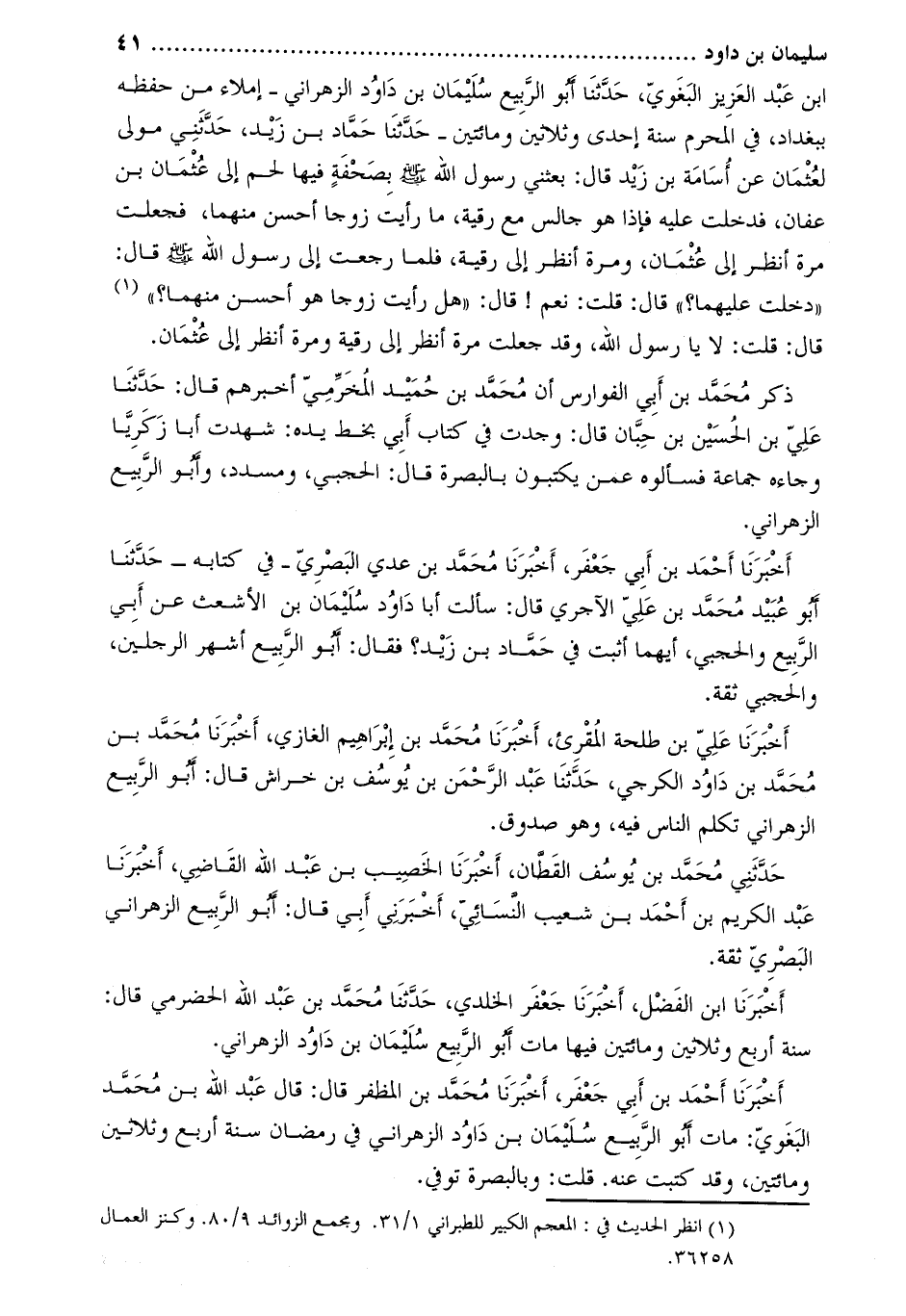 ابن عبد العزيز البغويّ، حَدَّثَنَا أَبُو الرَّبِيعِ سُلَيْمَانُ بْنُ دَاوُدَ الزَّهْرَانِيُّ- إِمْلاءً مِنْ حِفْظِهِ بِبَغْدَادَ، فِي الْمُحَرَّمِ سَنَةَ إحدى وثلاثين ومائتين- حدّثنا حمّاد بن زيد، حَدَّثَنِي مَوْلًى لِعُثْمَانَ عَنْ أُسَامَةَ بْنِ زَيْدٍ قَالَ: بَعَثَنِي رَسُولُ اللَّهِ صَلَّى اللَّهُ عَلَيْهِ وَسَلَّمَ بِصَحْفَةٍ فِيهَا لَحْمٌ إِلَى عُثْمَانَ بْنِ عَفَّانَ، فَدَخَلْتُ عَلَيْهِ فَإِذَا هُوَ جَالِسٌ مَعَ رُقَيَّةَ، مَا رَأَيْتُ زَوْجًا أَحْسَنَ مِنْهُمَا، فَجَعَلْتُ مَرَّةً أَنْظُرُ إِلَى عُثْمَانَ، وَمَرَّةً أَنْظُرُ إِلَى رُقَيَّةَ، فَلَمَّا رَجَعْتُ إِلَى رَسُولِ اللَّهِ صَلَّى اللَّهُ عَلَيْهِ وَسَلَّمَ قَالَ: