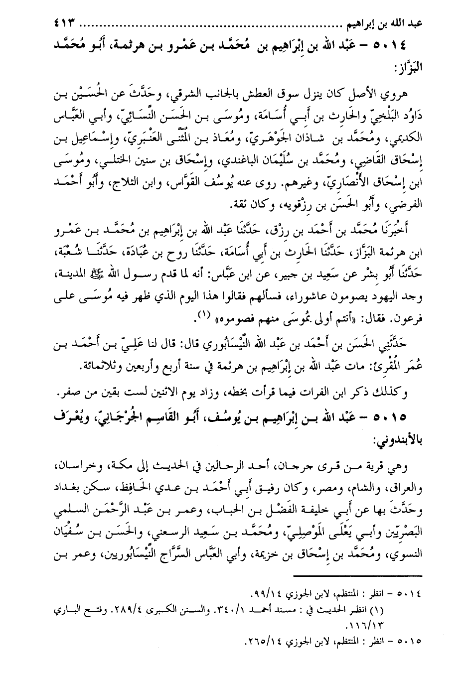 5014- عَبْد اللَّهِ بْن إِبْرَاهِيم بْنِ مُحَمَّدِ بْنِ عمرو بن هرثمة، أبو مُحَمَّد البزاز [1] :