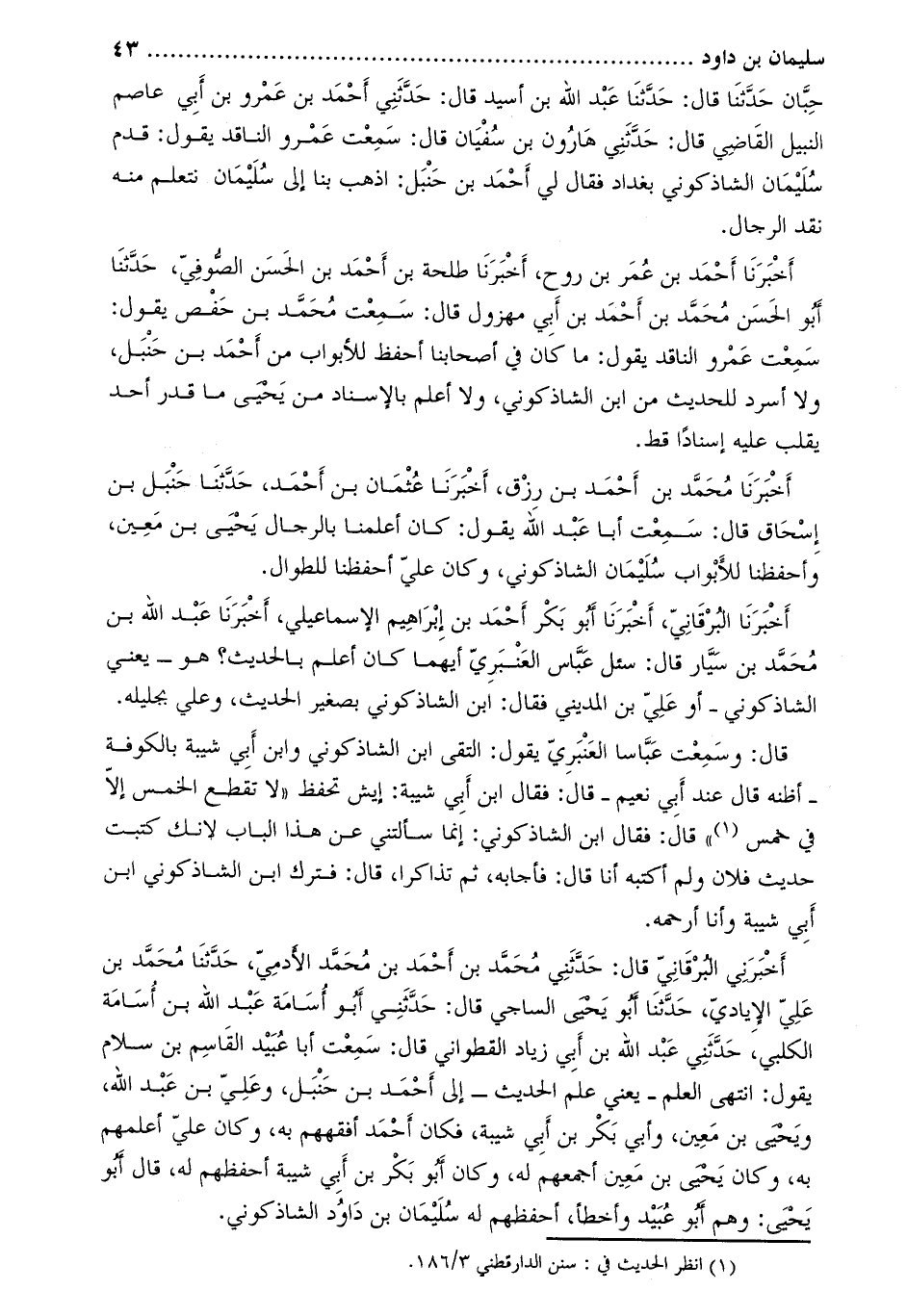 حبّان حَدَّثَنَا قال: حَدَّثَنَا عبد الله بن أسيد قال: حَدَّثَنِي أحمد بن عمرو بن أبي عاصم النبيل القاضي قال: حَدَّثَنِي هارون بن سفيان قال: سمعت عمرو الناقد يقول: قدم سليمان الشاذكوني بغداد فقال لي أحمد بن حنبل: اذهب بنا إلى سليمان نتعلم منه نقد الرجال.