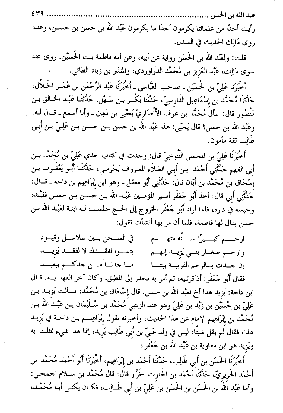 حَدَّثَنِي أبي قَالَ: أخذ أبو جعفر أمير المؤمنين عبد اللَّه بن حسن بن حسن فقيده وحبسه في داره، فلما أراد أبو جعفر الخروج إلى الحج جلست له ابنة لعبد اللَّه بن حسن يقَالَ لها فاطمة، فلما أن مر بها أنشأت تقول: