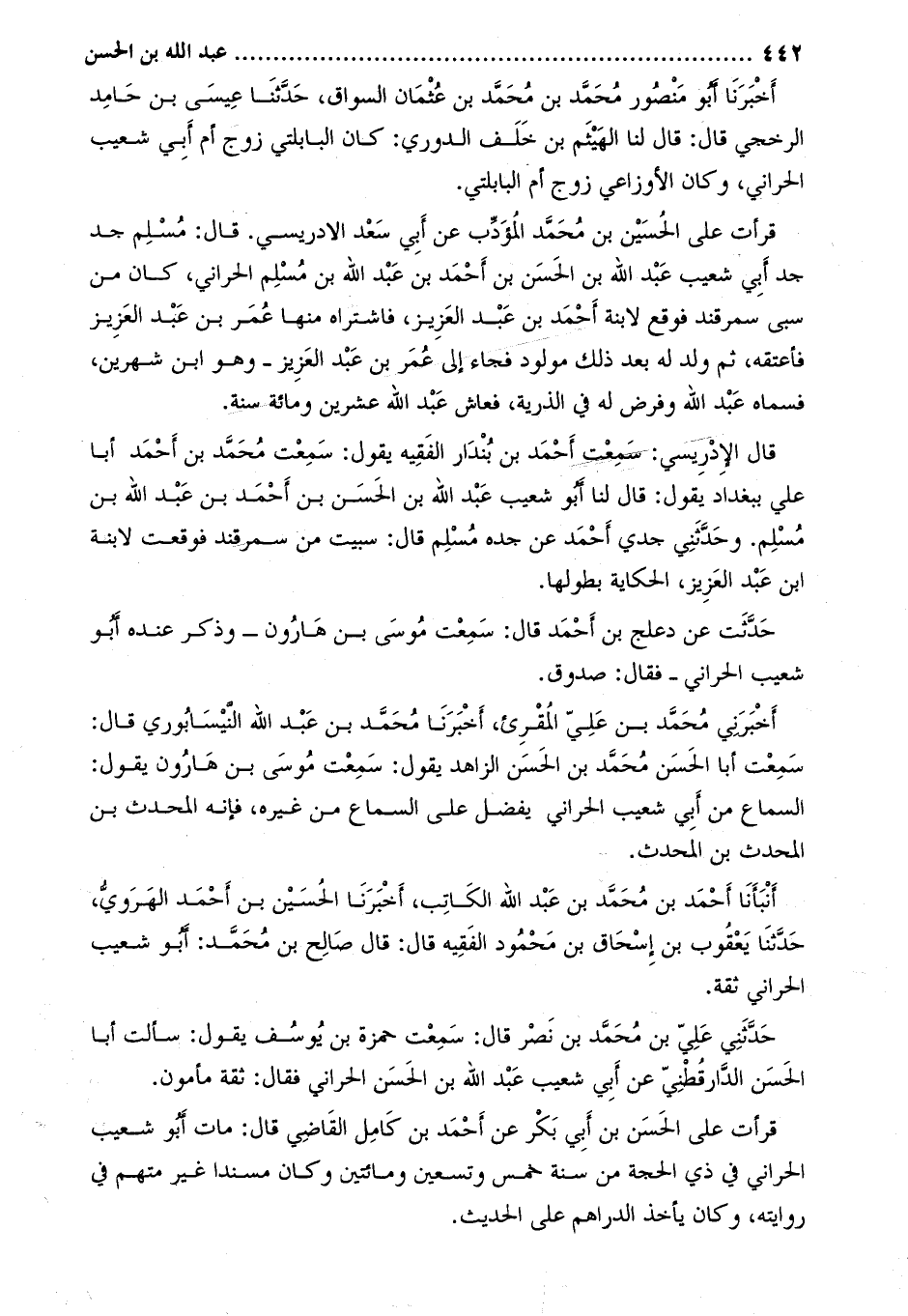 قرأت على الْحُسَيْن بْن مُحَمَّد المؤدب عَن أَبِي سعد الإدريسي. قَالَ: مسلم جد جد أبي شُعَيْبٍ عَبْدُ اللَّهِ بْنُ الْحَسَنِ بْنِ أَحْمَدَ بْنِ عَبْد اللَّهِ بْن مسلم الحراني، كان من سبي سَمرقند فوقع لابنة أَحْمَد بن عبد العزيز، فاشتراه منها عمر بن عبد العزيز فأعتقه، ثم ولد له بعد ذلك مولود فجاء إلى عمر بن عبد العزيز- وهو ابن شهرين، فسماه عبد اللَّه وفرض له في الذرية، فعاش عبد اللَّه عشرين ومائة سنة.