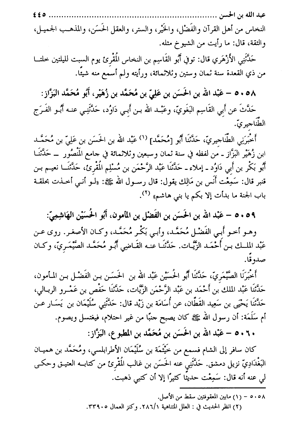 5058- عبد اللَّه بْن الْحَسَن بْن عَلِيِّ بْن مُحَمَّد بْن زهير، أبو مُحَمَّد البزاز: