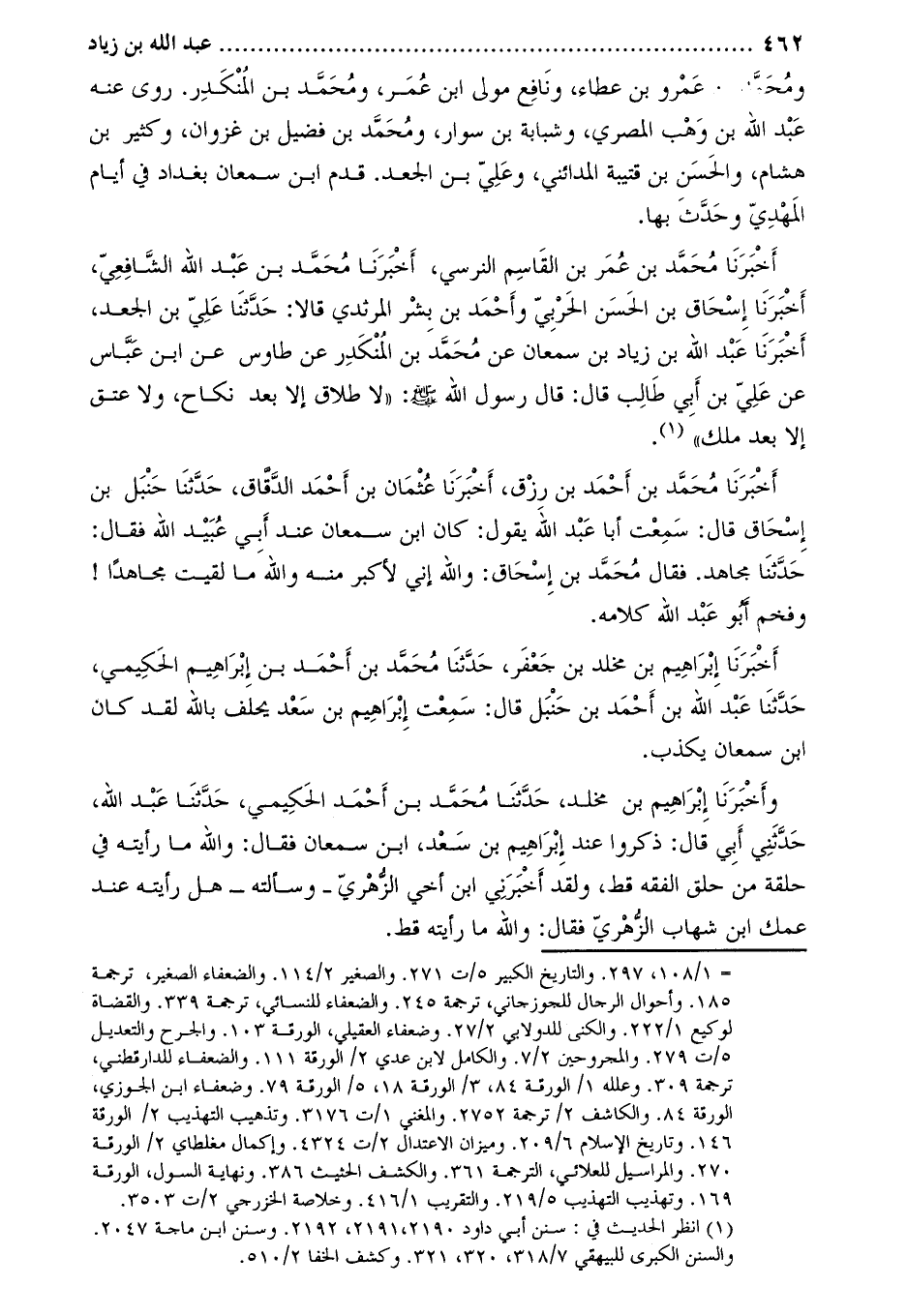 أَخْبَرَنَا مُحَمَّدُ بْنُ عُمَرَ بْنِ الْقَاسِمِ النَّرْسِيُّ، أخبرنا محمّد بن عبد الله الشّافعيّ، أَخْبَرَنَا إِسْحَاقُ بْنُ الْحَسَنِ الْحَرْبِيُّ وَأَحْمَدُ بْنُ بِشْرٍ الْمَرْثَدِيُّ قَالا: حَدَّثَنَا عَلِيُّ بْنُ الْجَعْدِ، أَخْبَرَنَا عَبْدُ اللَّهِ بْنُ زِيَادِ بْنِ سَمْعَانَ عَنْ مُحَمَّدِ بْنِ الْمُنْكَدِرِ عَنْ طَاوُسٍ عَنِ ابْنِ عَبَّاسٍ عَنْ عَلِيِّ بْنِ أَبِي طَالِبٍ قَالَ: قَالَ رَسُولُ اللَّهِ صَلَّى اللَّهُ عَلَيْهِ وَسَلَّمَ: «لا طَلاقَ إِلا بَعْدَ نِكَاحٍ، وَلا عِتْقَ إِلا بَعْدَ مِلْكٍ» [1]