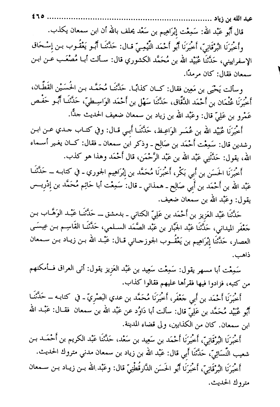 حَدَّثَنَا عَبْد العزيز بْن أَحْمَد بْن علي الكتاني- بدمشق- حدّثنا عبد الوهّاب بن جعفر الميداني، حَدَّثَنَا عبد الجبار بن عبد الصمد السلمي، حدّثنا القاسم بن عيسى العصار، حدثنا إبراهيم بن يعقوب الجوزجاني قال: عبد اللَّه بْن زياد بْن سمعان ذاهب.