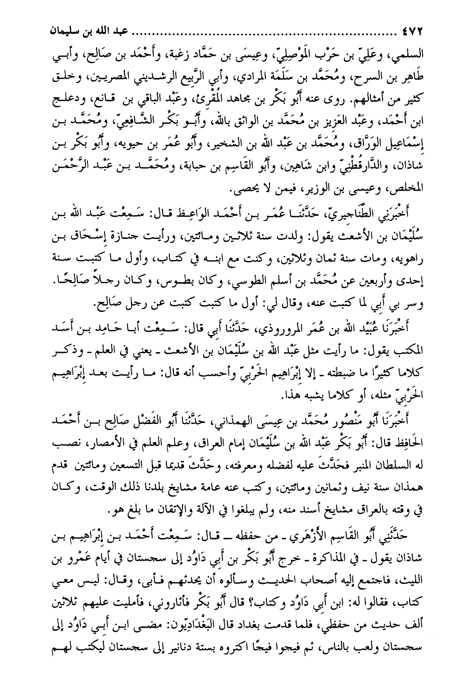 أَخْبَرَنَا أبو منصور مُحَمَّد بن عيسى الهمذاني، حَدَّثَنَا أَبُو الْفَضْل صالح بْن أَحْمَدَ الْحَافِظُ قَالَ: أبو بكر عبد اللَّه بن سليمان إمام العراق، وعلم العلم في الأمصار، نصب له السلطان المنبر فحدث عليه لفضله ومعرفته، وحدث قديمًا قبل التسعين ومائتين قدم همذان سنة نيف وثمانين ومائتين، وكتب عنه عامة مشايخ بلدنا ذلك الوقت، وكان في وقته بالعراق مشايخ أسند منه، ولم يبلغوا في الآلة والإتقان ما بلغ هو.