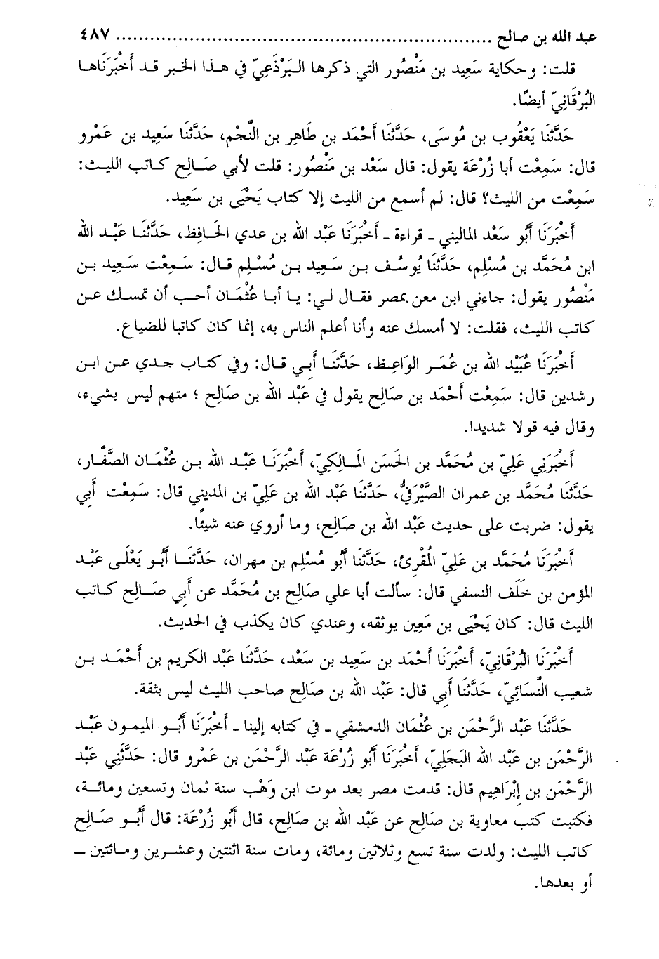 حدّثنا يعقوب بن موسى، حدّثنا أحمد بن طاهر بن النّجم، حَدَّثَنَا سَعِيد بْن عَمْرو قَالَ: سمعت أبا زرعة يقول: قال سعد بن منصور: قلت لأبي صالح كاتب الليث: