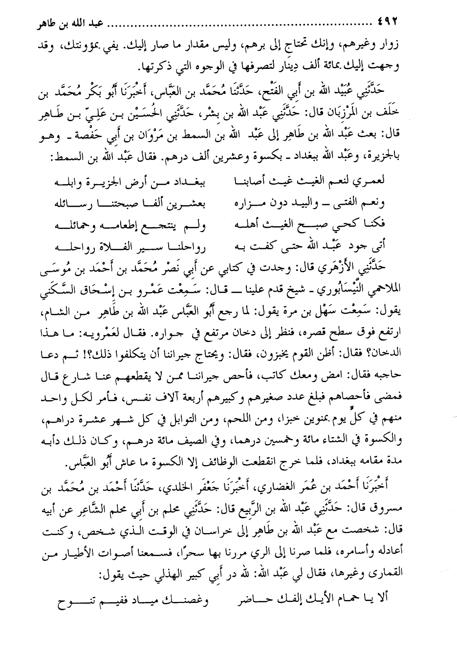 حَدَّثَنِي الأزهري قَالَ: وجدت في كتابي عن أبي نصر مُحَمَّد بن أَحْمَد بن موسى الملاحمي النيسابوري- شيخ قدم علينا- قَالَ: سمعت عمرو بن إسحاق السّكني يقول: سمعت سهل بن مرة يَقُول: لما رجع أبو العباس عبد اللَّه بن طاهر من الشام، ارتفع فوق سطح قصره، فنظر إلى دخان مرتفع فِي جِوَارِهِ. فَقَالَ لعمرويه: ما هذا الدخان؟ فَقَالَ: أظن القوم يخبزون، فَقَالَ: ويحتاج جيراننا أن يتكلفوا ذلك؟! ثم دعا حاجبه فَقَالَ: امض ومعك كاتب، فأحص جيراننا ممن لا يقطعهم عنا شارع قال فمضى فأحصاهم فبلغ عدد صغيرهم وكبيرهم أربعة آلاف نفس، فأمر لكل واحد منهم في كلّ يوم بمنوين خبزا، ومن اللحم، ومن التوابل في كل شهر عشرة دراهم، والكسوة في الشتاء مائة وخمسين درهمًا، وفي الصيف مائة درهم، وكان ذلك دأبه مدة مقامه ببغداد، فلما خرج انقطعت الوظائف إلا الكسوة ما عاش أبو العباس.