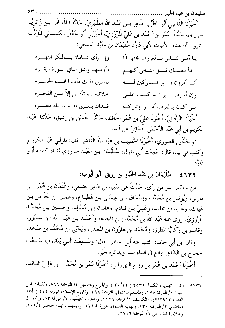 أخبرنا الْقَاضِي أَبُو الطَّيِّبِ طَاهِرُ بْنُ عَبْدِ اللَّهِ الطّبريّ، حدّثنا المعافى بن زكريّا الجريري، حَدَّثَنَا عُمَرُ بْنُ أَحْمَدَ بْنِ عَلِيٍّ الْمَرْوَزِيُّ، أَخْبَرَنِي أبو جعفر الكمساني المؤدب- بمرو- أن هذه الأبيات لأبي داود سليمان بن معبد السنجي:
