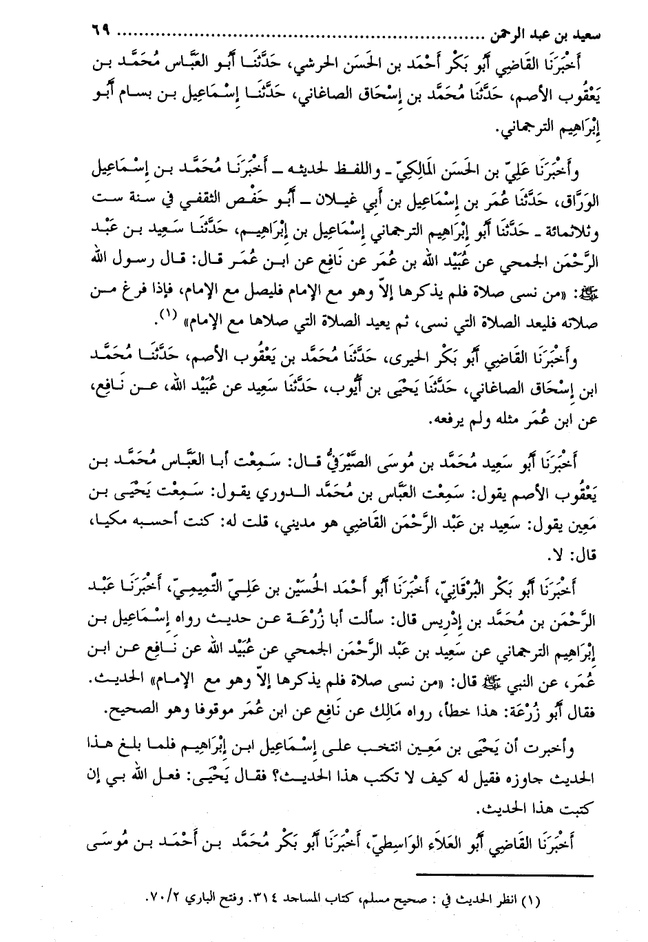أَخْبَرَنَا أَبُو بكر البرقانيّ، أَخْبَرَنَا أبو أحمد الحسين بن علي التميمي، أَخْبَرَنَا عَبْدُ الرَّحْمَنِ بْنُ مُحَمَّدِ بْنِ إِدْرِيسَ قَالَ: سَأَلْتُ أَبَا زُرْعَةَ عَنْ حَدِيثٍ رَوَاهُ إِسْمَاعِيلُ بْنُ إِبْرَاهِيمَ التَّرْجُمَانِيُّ عَنْ سَعِيدِ بْنِ عَبْدِ الرَّحْمَنِ الْجُمَحِيِّ عَنْ عُبَيْدِ اللَّهِ عَنْ نَافِعٍ عَنِ ابْنِ عُمَرَ، عَنِ النَّبِيِّ صَلَّى اللَّهُ عَلَيْهِ وَسَلَّمَ قَالَ: «مَنْ نَسِيَ صَلاةً فَلَمْ يَذْكُرْهَا إِلا وَهُوَ مَعَ الإِمَامِ»