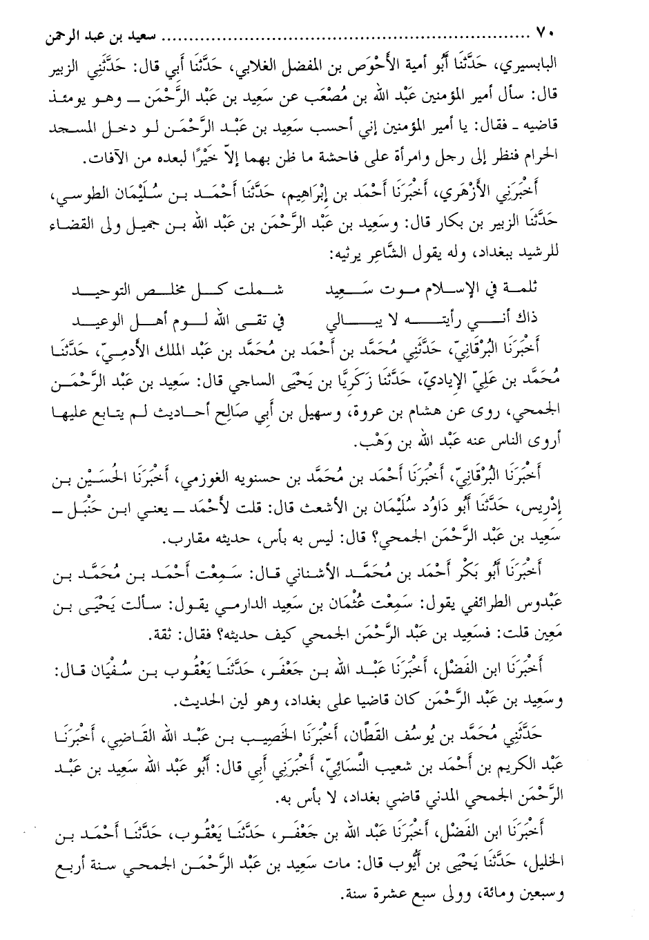 وسعيد بن عبد الرحمن كان قاضيا على بغداد، وهو لين الحديث.