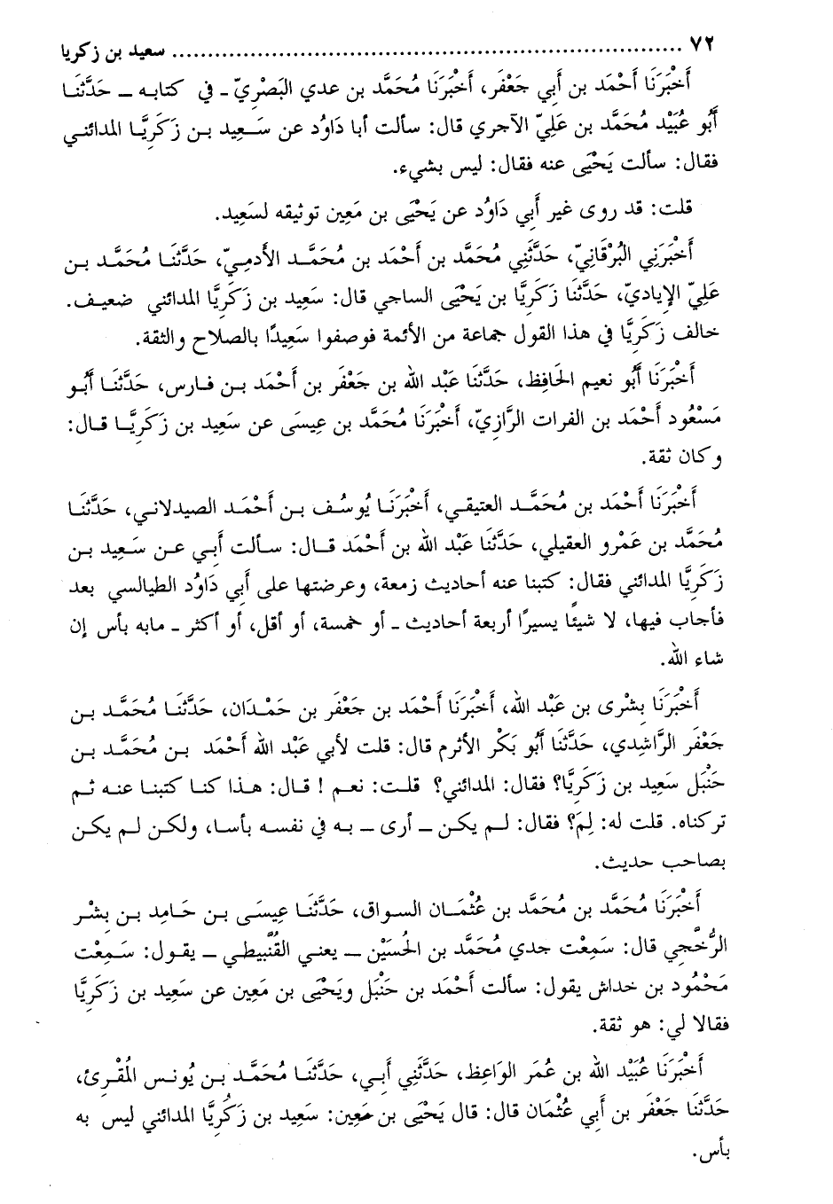 أَخْبَرَنِي البرقاني، حَدَّثَنِي مُحَمَّد بْن أَحْمَدَ بْن مُحَمَّد الآدمي، حدّثنا محمّد بن عليّ الإياديّ، حَدَّثَنَا زكريا بن يحيى الساجي قال: سعيد بن زكريا المدائني ضعيف.