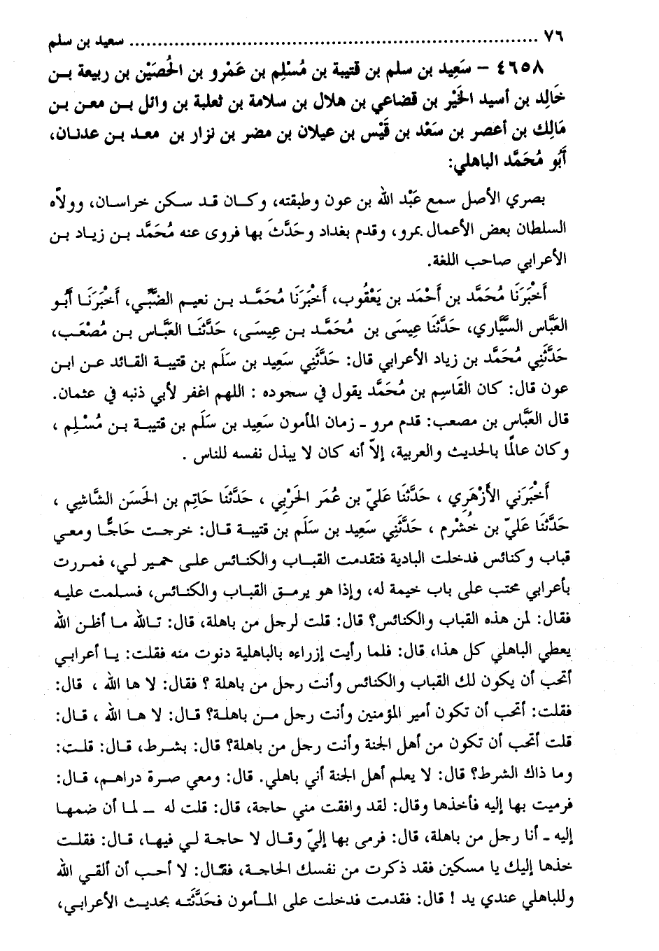 أخبرني الأزهري، حدّثنا عليّ بن عمر الحربي، حدّثنا حاتم بن الحسن الشّاشي، حدّثنا عليّ بن خشرم، حَدَّثَنِي سعيد بن سلم بن قتيبة قال: خرجت حاجا ومعي قباب وكنائس فدخلت البادية فتقدمت القباب والكنائس على حمير لي، فمررت بأعرابي محتب على باب خيمة له، وإذا هو يرمق القباب والكنائس، فسلمت عليه فقال: لمن هذه القباب والكنائس؟ قال: قلت لرجل من باهلة، قال: تالله ما أظن الله يعطي الباهلي كل هذا، قال: فلما رأيت إزراءه بالباهلية دنوت منه فقلت: يا أعرابي أتحب أن يكون لك القباب والكنائس وأنت رجل من باهلة؟ قال: لا ها الله، قال: