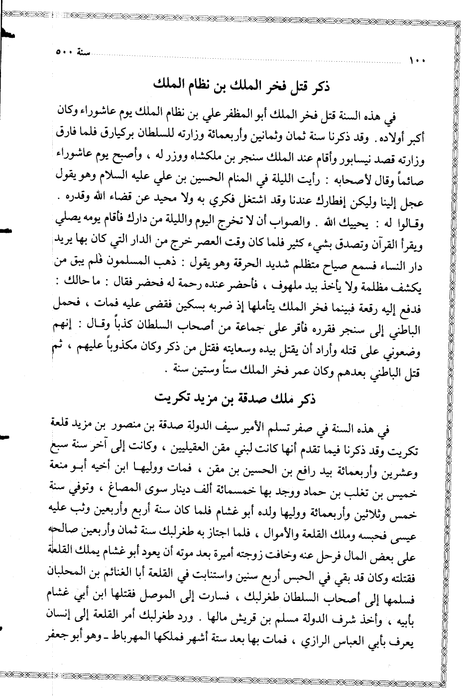 في هذه السنة قتل فخر الملك أبو المظفر علي بن نظام الملك يوم عاشوراء وكان وزارته قصد نيسابور لأصحابه رأيت الليلة في المنام الحسين بن علي عليه السلام وهو يقول عجل إلينا وليكن إفطارك عندنا وقد اشتغل فكري به ولا محيد عن قضاء الله وقدره