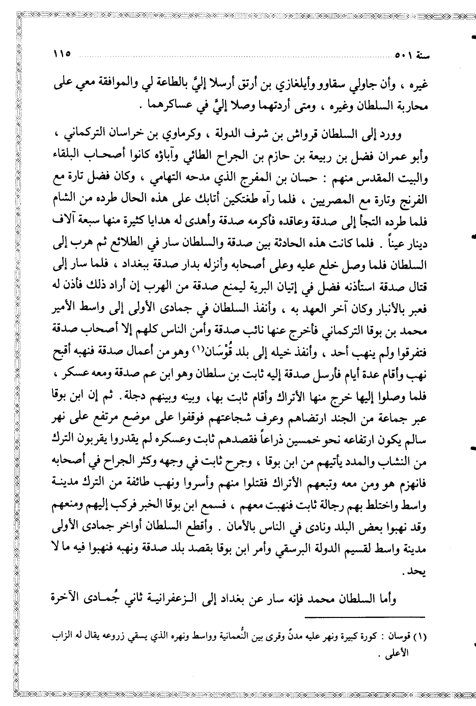 فلما كانت هذه الحادثة بين صدقة والسلطان سار في الطلائع ثم هرب إلى السلطان فلما وصل خلع عليه وعلى أصحابه وأنزله بدار صدقة ببغداد فلما سار إلى قتال صدقة استأذنه فضل في إتيان البرية ليمنع صدقة من الهرب إن أراد ذلك فأذن له فعبر بالأنبار وكان آخر العهد به وأنفذ السلطان في جمادى الأولى إلى واسط الأمير محمد بن بوقا التركماني فأخرج عنها نائب صدقة وأمن الناس كلهم إلا أصحاب صدقة فتفرقوا ولم ينهب أحد وأنفذ خيله إلى بلد قوسان وهو من أعمال صدقة فنهبه أقبح نهب وأقام عدة أيام فأرسل صدقة إليه ثابت بن سلطان وهو ابن عم صدقة ومعه عسكر فلما وصلوا إليها خرج منها الأتراك وأقام ثابت بها وبينه وبينهم دجلة
