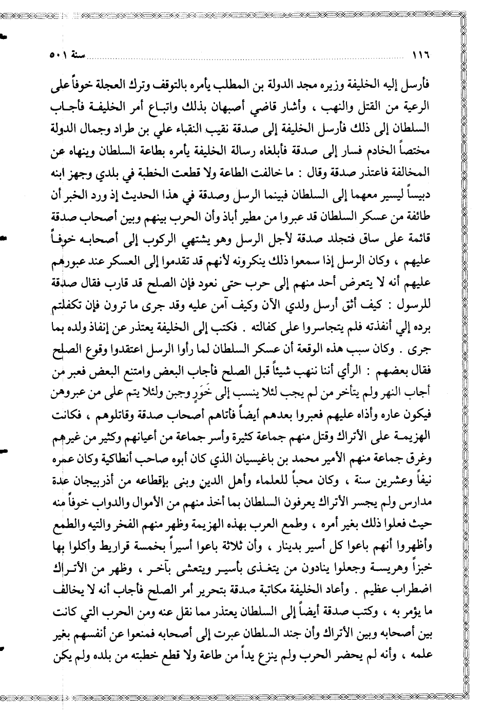 وأعاد الخليفة مكاتبة صدقة بتحرير أمر الصلح فأجاب أنه لا يخالف ما يؤمر به وكتب صدقة أيضا إلى السلطان يعتذر مما نقل عنه ومن الحرب التي كانت بين أصحابه وبين الأتراك وأن جند السلطان عبرت إلى أصحابه فمنعوا عن أنفسهم بغير علمه وأنه لم يحضر الحرب ولم ينزع يدا من طاعة ولا قطع خطبته من بلده ولم يكن