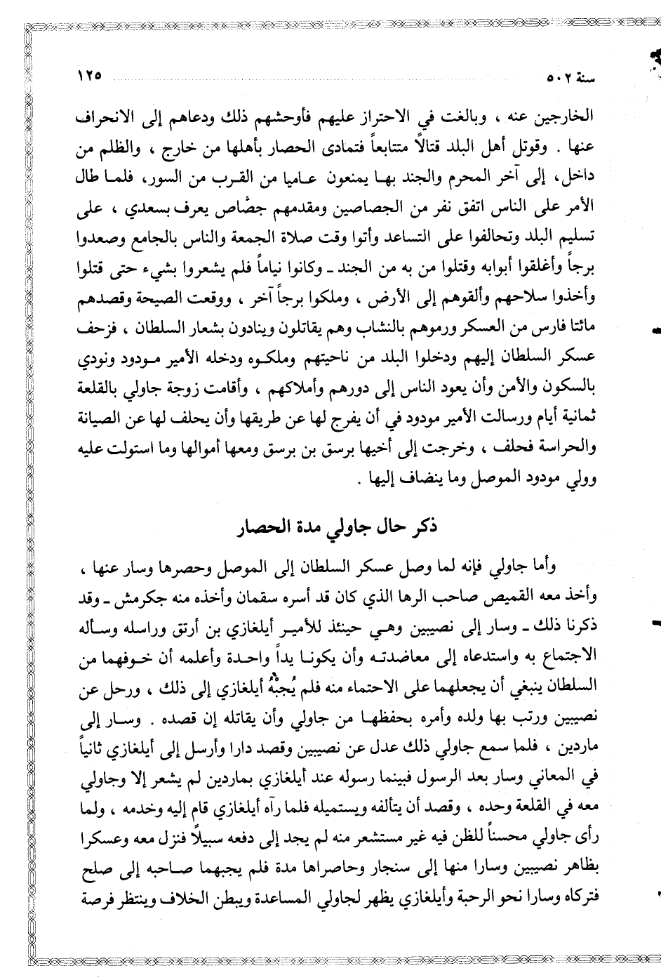 وسار إلى ماردين فلما سمع جاولي ذلك عدل عن نصيبين وقصد دارا وأرسل إلى أيلغازي ثانيا في المعاني وسار بعد رسول الله فبينما رسوله عند أيلغازي بماردين لم يشعر إلا وجاولي معه في القلعة وحده وقصد أن يتألفه ويستمليه فما رآه أيلغازي قام إليه وخدمه ولما رأى جاولي محسنا للظن فيه غير مستشعر منه لم يجد إلى دفعه سبيلا فنزل معه وعسكرا بظاهر نصيبين وسارا منها إلى سنجار وحاصراها مدة فلم يجبهما صاحبه إلى صلح فتركاه وسارا نحو الرحبة وأيلغازي يظهر لجاولي المساعدة ويبطن الخلاف وينتظر فرصة