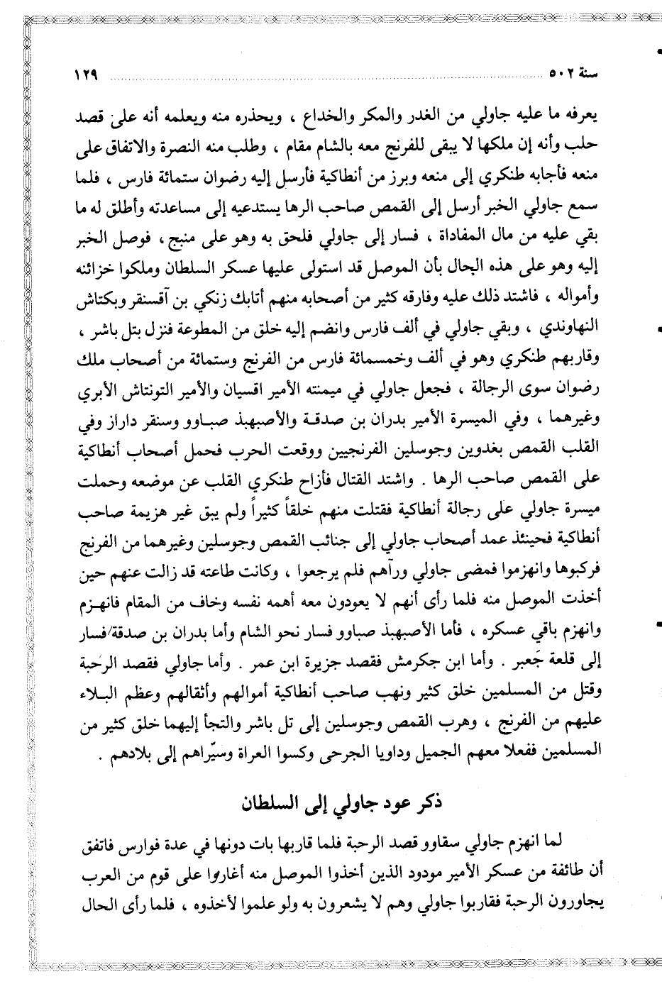 يعرفه ما عليه جاولي من الغدر والمكر والخداع ويحذره منه ويعلمه أنه على قصد حلب وأنه إن ملكها لا يبقى للفرنج معه بالشام مقام وطلب منه النصرة والاتفاق على منعه فأجابه طنكري إلى منعه وبرز من أنطاكية فأرسل إليه رضوان ستمائة فارس فلما سمع جاولي الخبر أرسل إلى القمص صاحب الرها يستدعيه إلى مساعدته وأطلق له ما بقي عليه من مال المفاداة فسار إلى جاولي فلحق به وهو على منبج فوصل الخبر إليه وهو على هذه الحال بأن الموصل قد استولى عليها عسكر السلطان وملكوا خزائنه وأمواله فاشتد ذلك عليه وفارقه كثير من أصحابه منهم أتابك زنكي بن آقسنقر وبكتاش النهاوندي وبقي جاولي في ألف فارس وانضم إليه خلق من المطوعة فنزل بتل باشر وقاربهم طنكري وهو في ألف وخمسمائة فارس من الفرنج وستمائة من أصحاب ملك رضوان سوى الرجالة فجعل جاولي في ميمنته الأمير اقيسان والأمير التونتاش الأبري وغيرهما وفي المسيرة الأمير بدران بن صدقة والأصبهبذ صباوو وسنقر داراز وفي القلب القمص بغدوين وجوسلين الفرنجيين وقعت الحرب فحمل أصحاب أنطاكية على القمص صاحب الرها