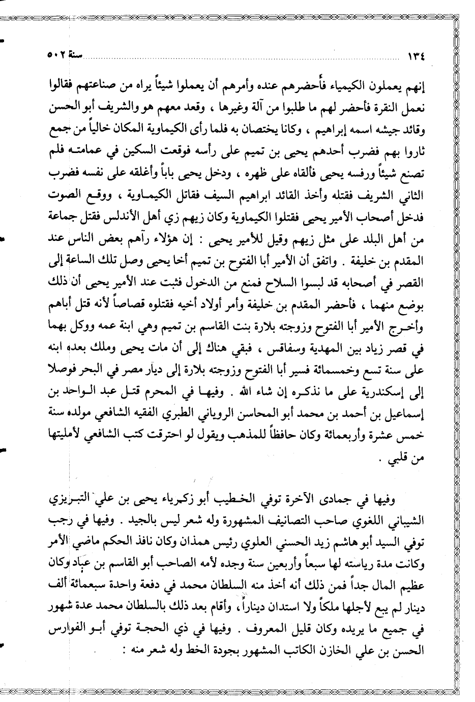 وفيها في المحرم قتل عبد الواحد بن إسماعيل بن أحمد بن محمد أبو المحاسن الروياني الطبري الفقيه الشافعي مولده سنة خمس عشرة وأربعمائة وكان حافظا للمذهب ويقول لو احترقت كتب الشافعي لأمليتها من قلبي