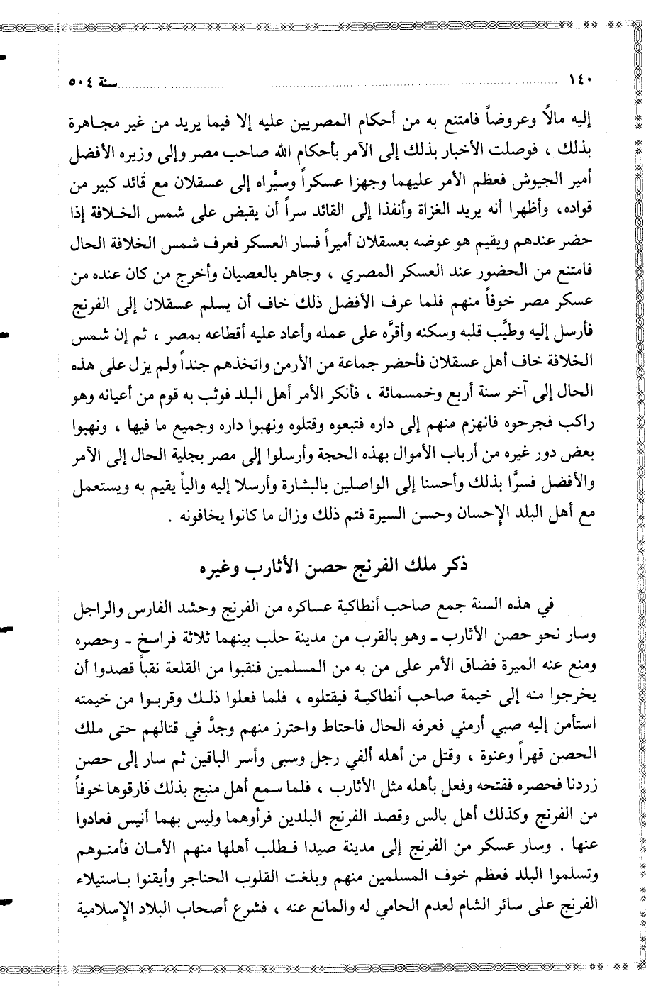 في هذه السنة جمع صاحب أنطاكية عساكره من الفرنج وحشد الفارس والراجل وسار نحو حصن الأثارب وهو بالقرب من مدينة حلب بينهما ثلاثة فراسخ وحصره ومنع عنه الميرة فضاق الأمر على من به من المسلمين فنقبوا من القلعة نقبا قصدوا أن يخرجوا منه إلى خيمة صاحب أنطاكية فيقتلوه فلما فعلوا ذلك وقربوا من خيمته استأمن إليه صبي أرمني فعرفه الحال فاحتاط واحترز منهم وجد في قتالهم حتى ملك الحصن قهرا وعنوة وقتل من أهله ألفي رجل وسبى وأسر الباقين ثم سار إلى حصن زردنا فحصره وفعل بأهله مثل الأثارب فلما سمع أهل منبج بذلك فارقوها خوفا من الفرنج وكذلك أهل بالس وقصد الفرنج البلدين فرأوهما وليس بهما أنيس فعادوا عنها